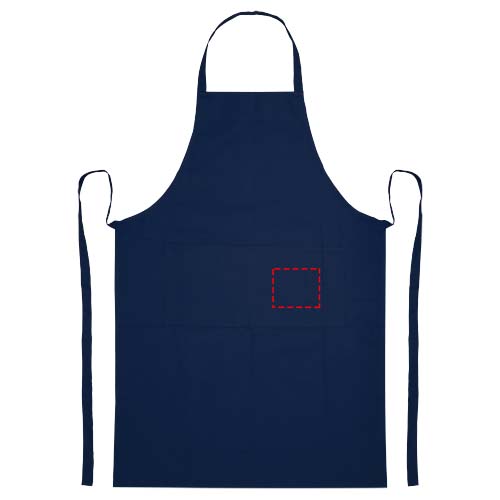 Экологичный фартук из органического хлопка плотностью 200 г/м². Оснащён двумя смежными карманами общим размером 45 × 20 см и завязкой на спине длиной 1 метр. Длина шейного ремешка: 55 см.