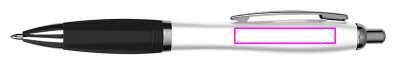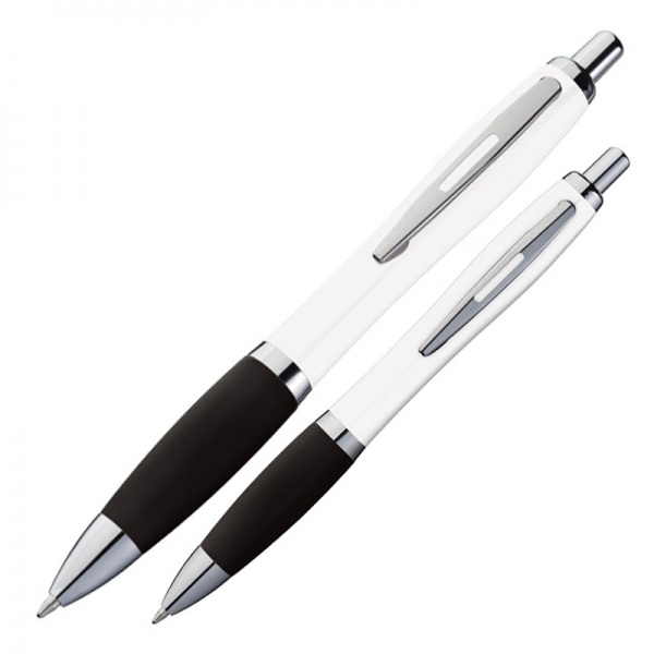 Шариковая ручка с белым корпусом, металлическим зажимом, синим стержнем большой емкости и цветной мягкой зоной захвата. Мы напечатаем ваш логотип на правой стороне зажима.