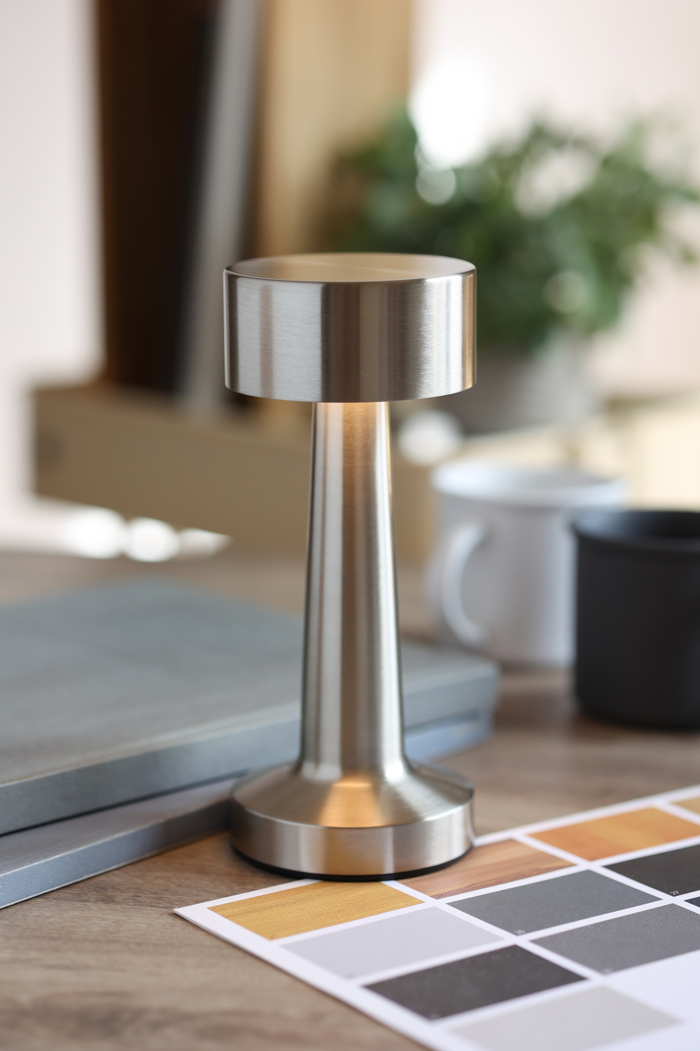Iron table lamp with 12 LED lights, stepless dimming, 3 light modes and touch control. USB port and rechargeable Li-Ion 1200 mAh battery. 6hr working time after fully charged. Including charging cable.