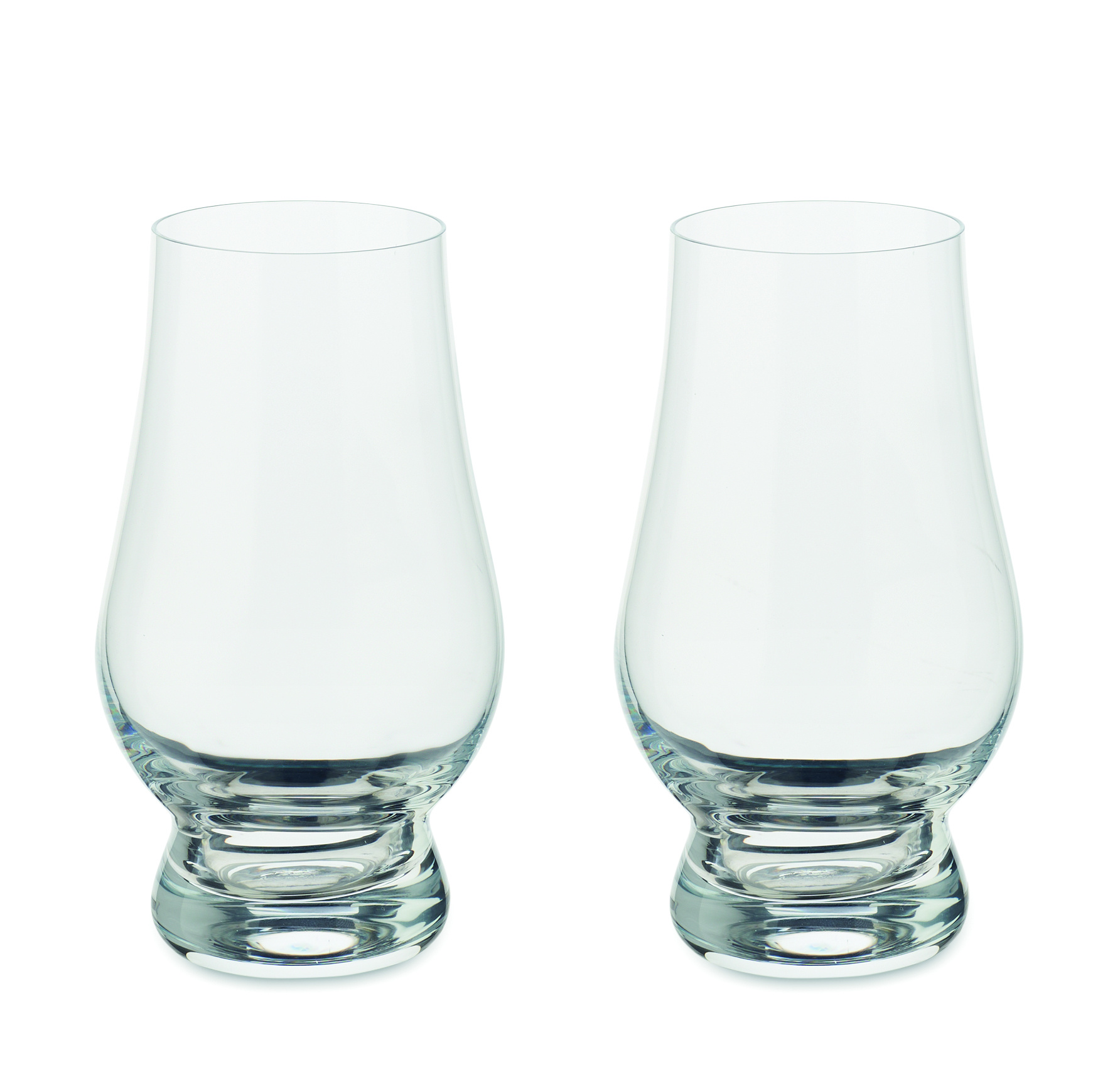 Set of 2 sniffer tasting glasses (200ml) for whisky or other liquors, 2 reusable stainless steel ice cubes, tongs and ice cube storage cotton pouch. Presented in gift box.