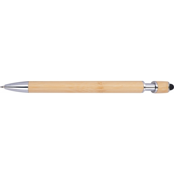 Шариковая ручка Bamboo со стилусом. Шариковая ручка имеет серебристые пластиковые акценты, металлический зажим и большой стержень из синего пластика.