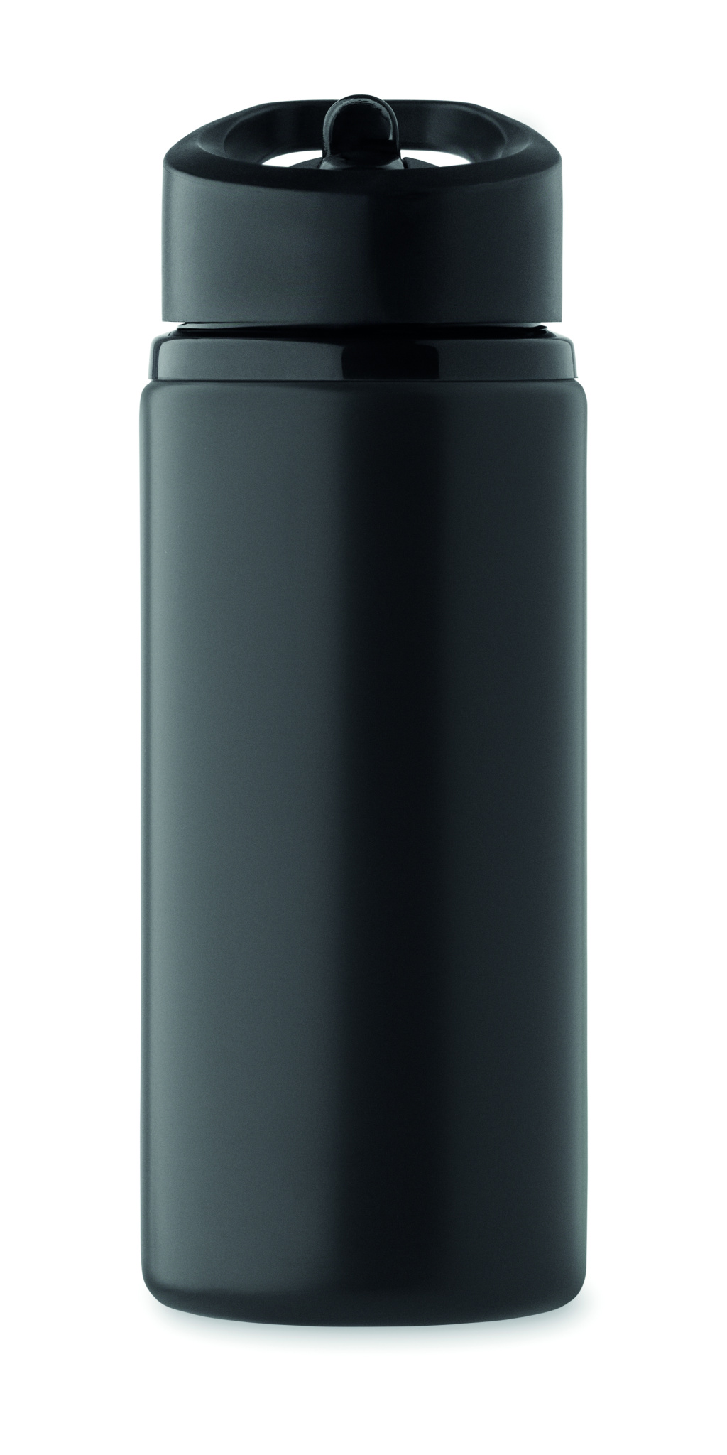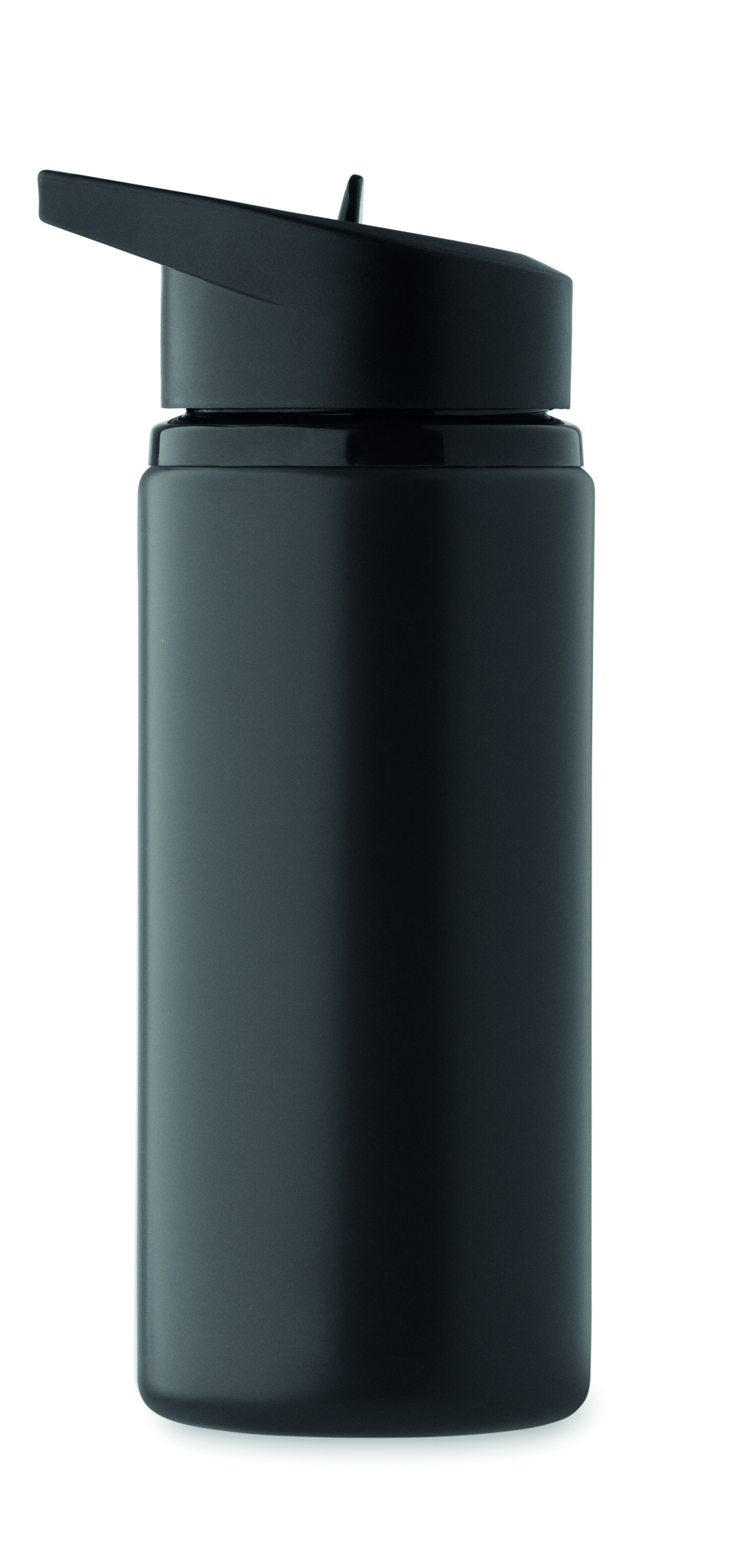 Recycled stainless steel (90% recycled stainless steel and 10% stainless steel) single wall bottle with foldable mouth piece, straw and lid with carrying handle. Capacity: 500 ml.
