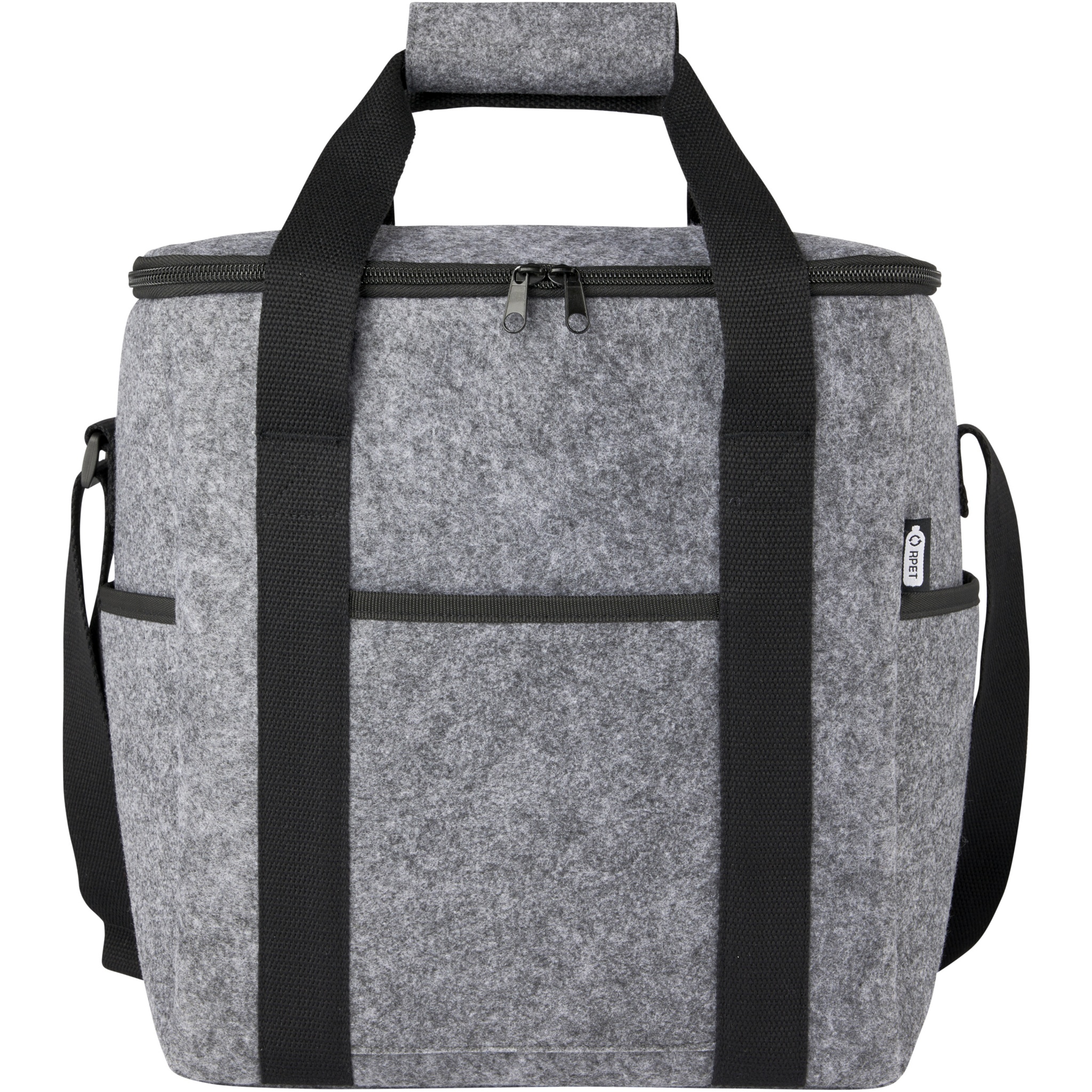 Большая сумка-холодильник, изготовленная из высококачественного мягкого и прочного фетра, переработанного по стандарту GRS. Имеет большое главное отделение (на шесть бутылок 1,5 л), отделанное высокоплотной термической PEVA-изоляцией, совместимой с пищевыми продуктами, позволяющей хранить напитки и закуски холодными на протяжении нескольких часов. Верхняя часть с застежкой на молнии, передний карман и два боковых кармана для дополнительной вместимости. Длинные регулируемые тканые плечевые ремни из хлопка (55 x 3,8 см) и 2 тканых хлопковых ручки для переноски (25 x 3,8 см) с верхней застежкой на липучке. Легко чистится. Емкость: 21 литр.
