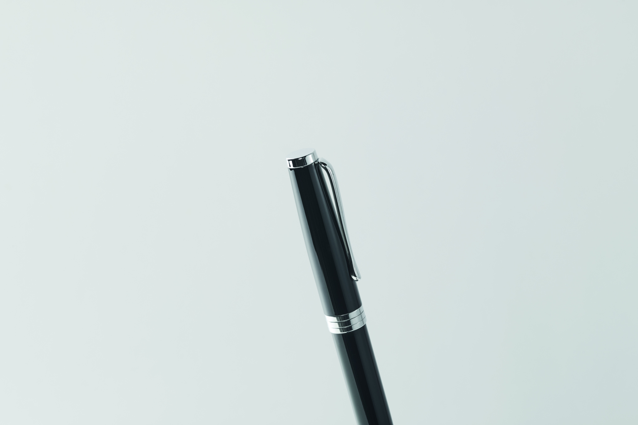 Twist ball pen in recycled stainless steel barrel. Blue ink. Presented in gift box.