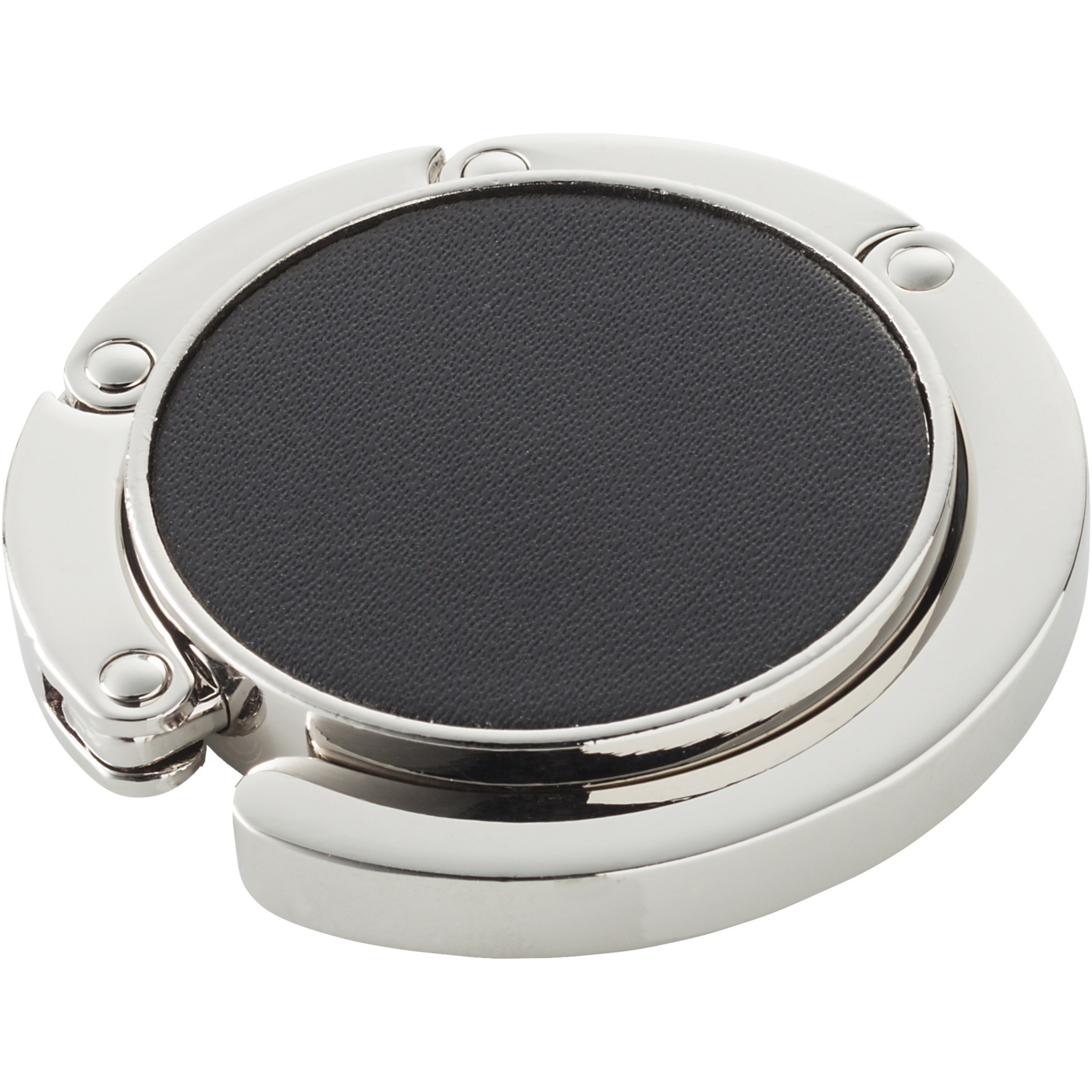 Складная вешалка для сумки, которая помогает уберечь сумку от загрязнения. Вешалку можно прикрепить на край поверхности; она выдерживает до 4,5 кг.