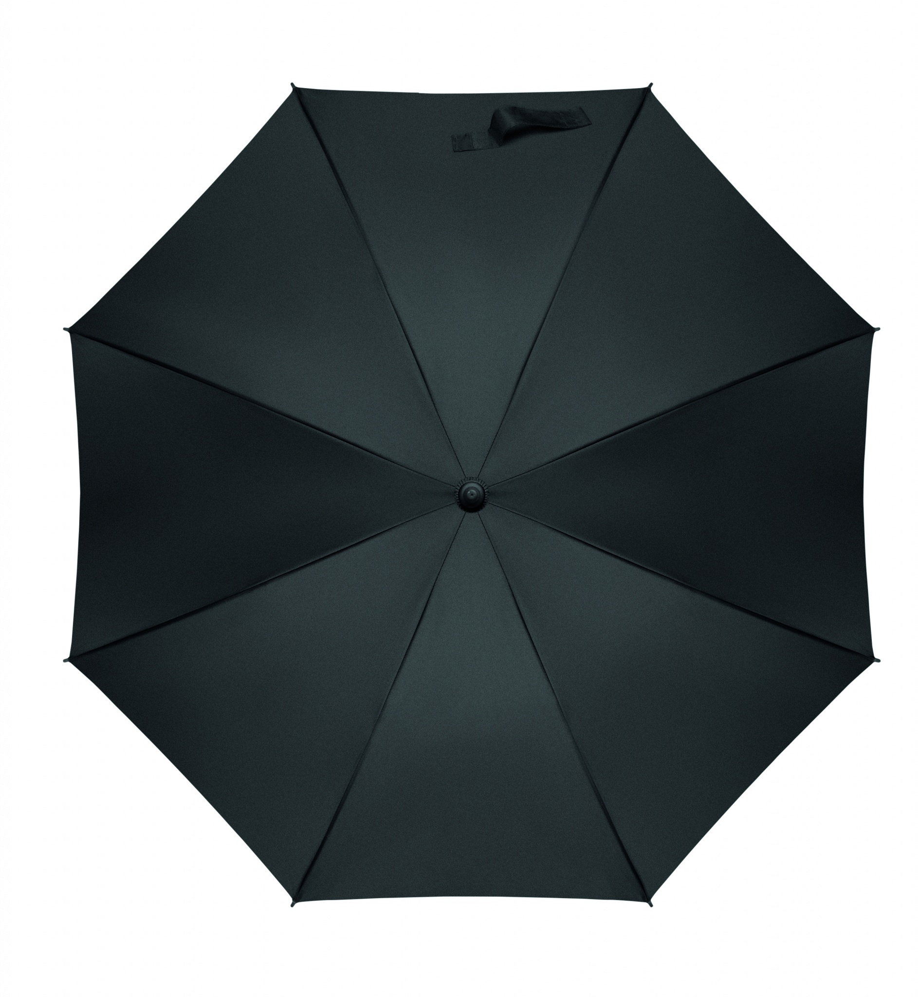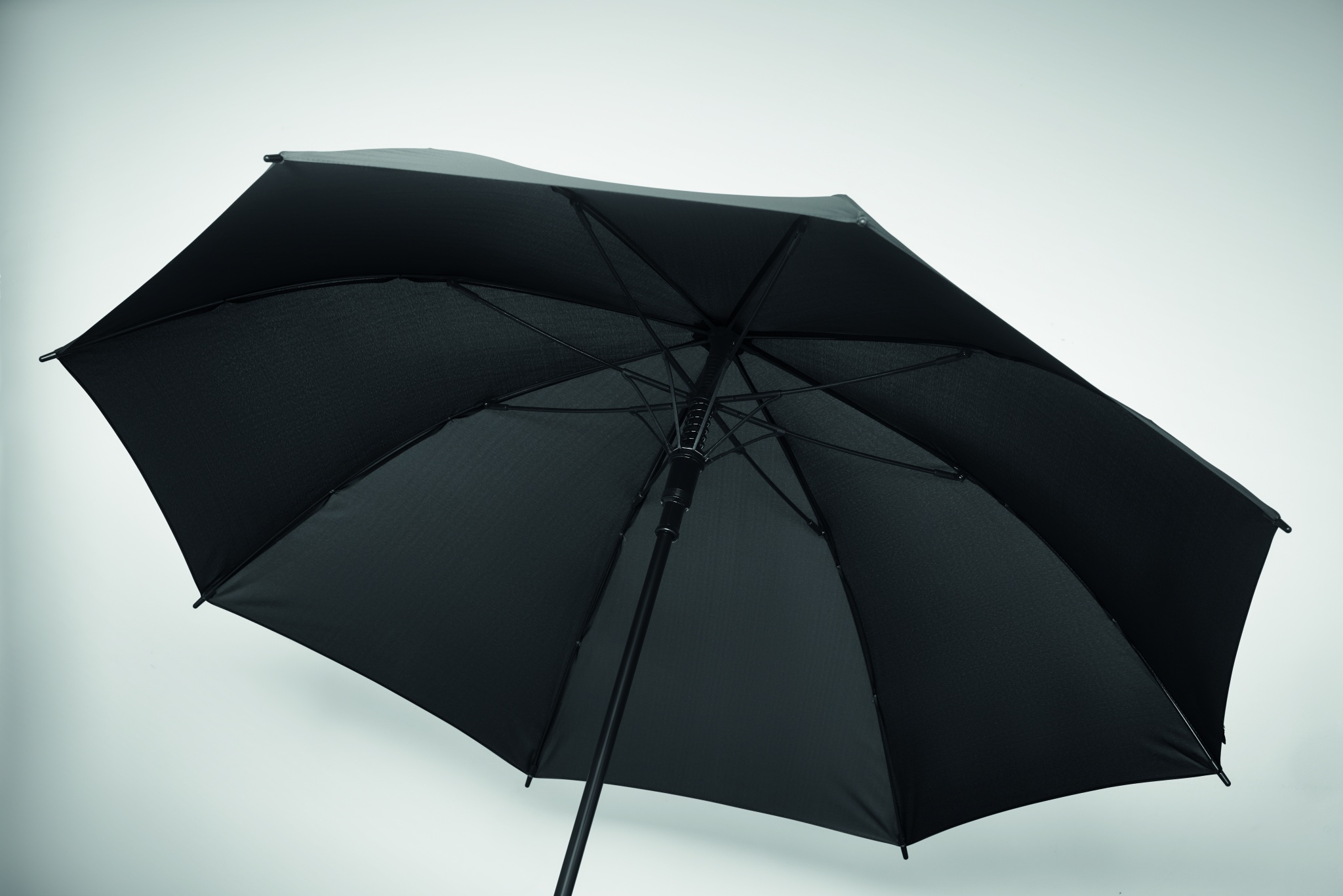 23-дюймовый ветроустойчивый зонт полуавтомат из эпонжа 190T с каркасом из стекловолокна, черным стержнем и пластиковыми наконечниками. Ручка из пластика с резиновым покрытием. Ручное закрытие