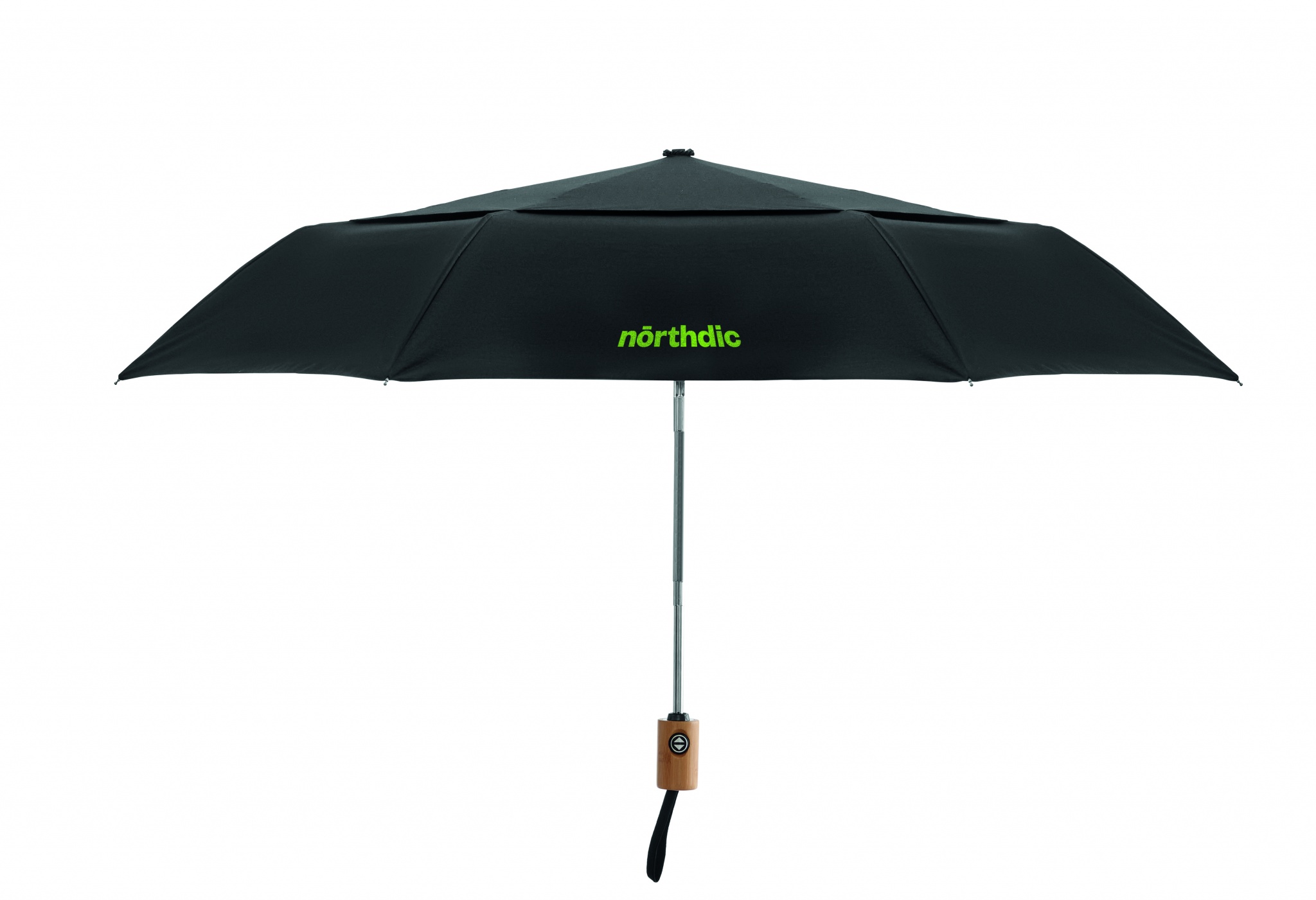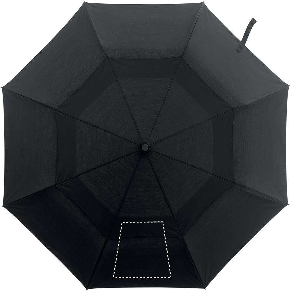 21 tums 2-stegs automatiskt stormsäkert paraply i 190T polybomull (70 % polyester och 30 % bomull) med hel aluminiumskaft, spetsar och bambuhandtag. Svarta ribbor i glasfiber. Inkluderar matchande fodral. Automatisk stängning.