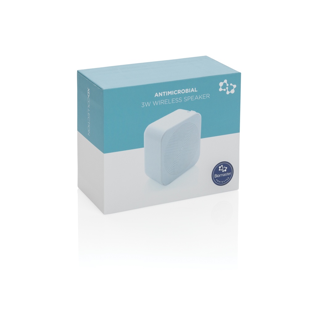 3W trådlös högtalare som är behandlad med Biomaster, ett antimikrobiellt medel som ger ett extra skydd mot skadliga bakterier. Det finns I produkten, inte PÅ produkten vilket ger dig ett permanent skydd. Produkten är testad enligt ISO 22196 för antimikrobiell effektivitet och är 100% säker och ofarlig för användare. Biomaster påverkar inte produktens återvinningsbarhet. Produkten innehåller också Verimaster, ett unikt spårämne inbyggt i materialet för att kunna bevisa att produkten är behandlad med Biomaster, till skillnad från många produkter på marknaden med antimikrobiella påståenden som är falska. Batteriet på 300 mAh ger en speltid på upp till 2 timmar och kan laddas upp på ca 1,5 timme. BT 5.0 med en räckvidd på upp till 10 meter. Levereras i lyxig presentkartong tillsammans med en förklaring om Biomaster. PVC-fri micro laddningskabel i TPE medföljer.