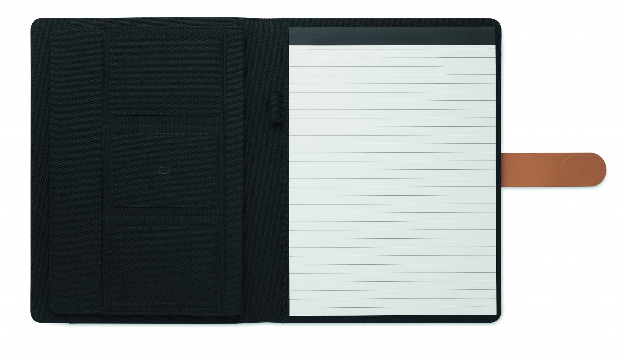 A4 konferensmapp i RPET med detaljer i konstläder. Utbytbara A4-anteckningsblock, 30 linjerade sidor med återvunnet papper. Pennhållare. 4 korthållare, 3 små fickor och ett stort fack. Magnetisk stängning.