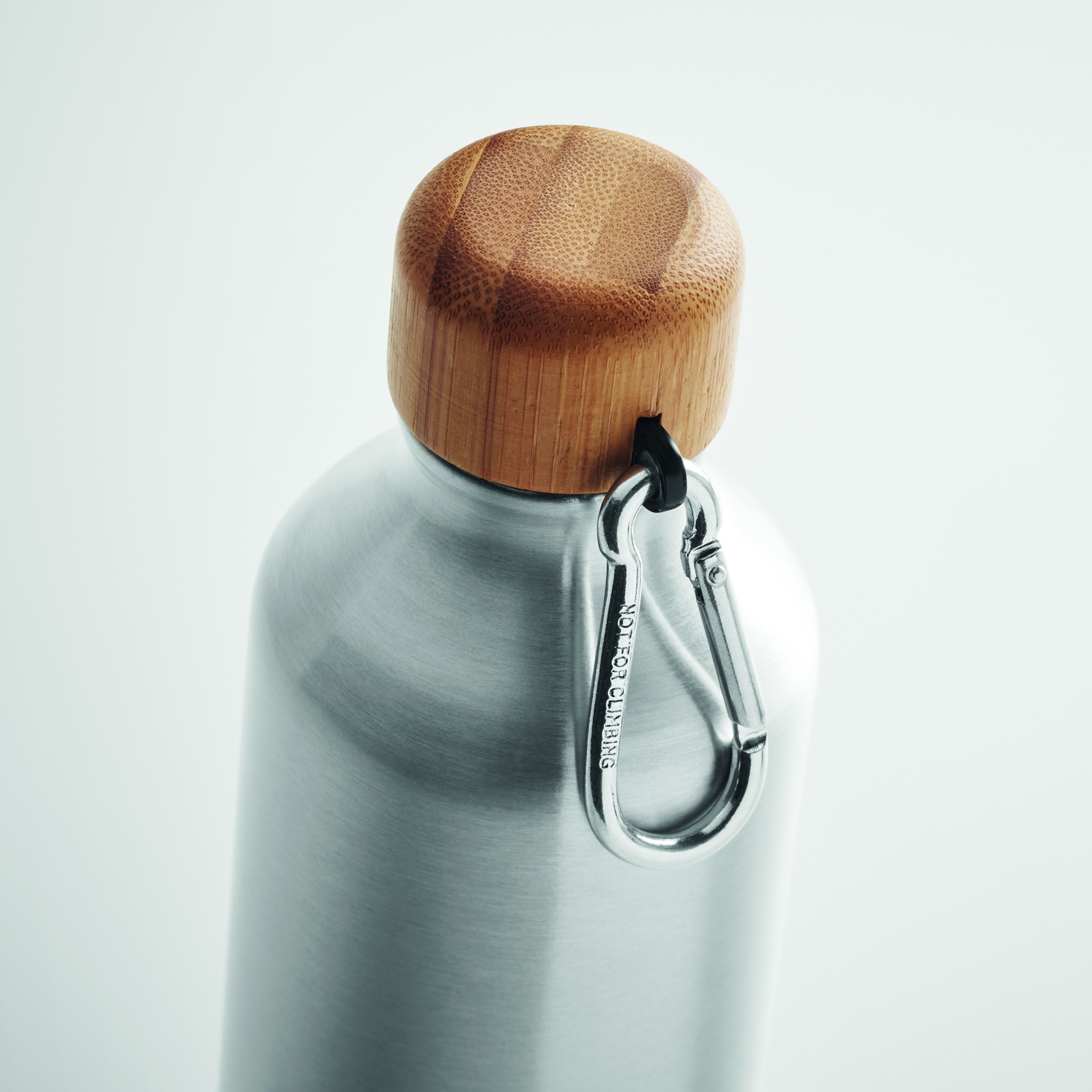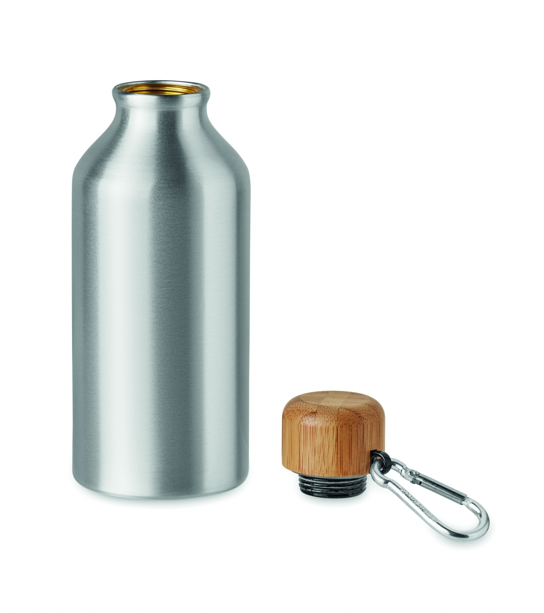 Aluminiumflaska i enkelvägg med bambukork och karbinhake. Volym: 400 ml. Skall ej köras i diskmaskin.