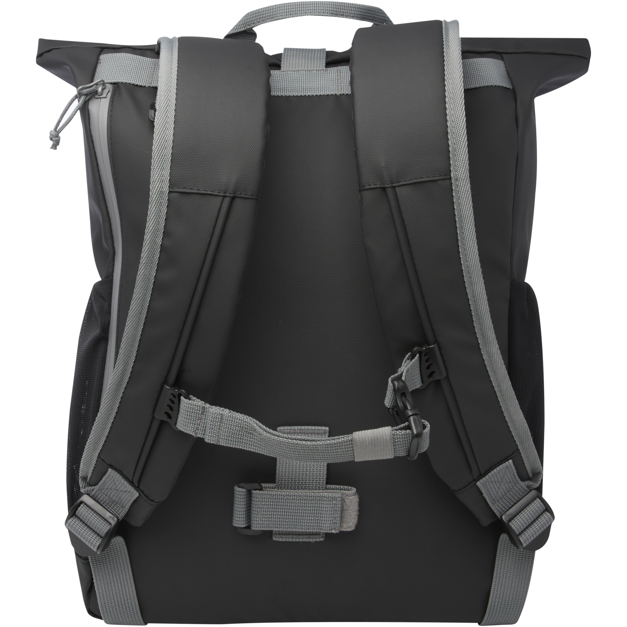 Vattentålig cykelväska med rullöppning tillverkad av GRS-certifierade återvunna material. Den har ett vadderat 15-tums fack för bärbar dator, flera organiseringsfickor, justerbart kardborreband för enkel montering på en mängd olika cyklar och reflekterande sömmar för ökad synlighet. De återvunna GRS-materialen inkluderar huvudtyget, fodret, väven och dragkedjorna. Kapacitet: 20 liter. PVC-fri.