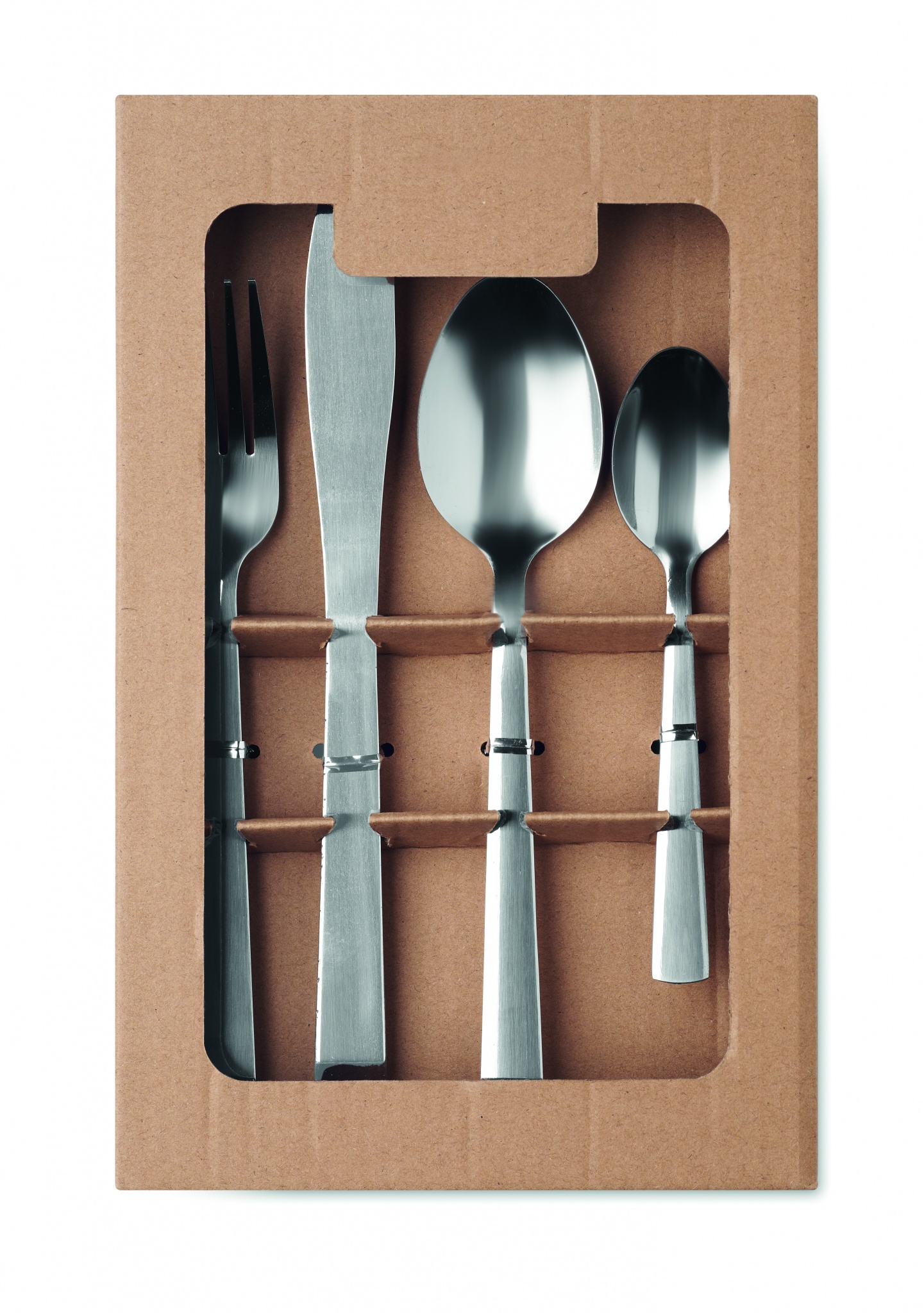 16-delad bestickset i rostfritt stål för 4 dukningar. Innehåller: tesked, bordssked, gaffel, kniv. Presenteras i en kraftpapperslåda.