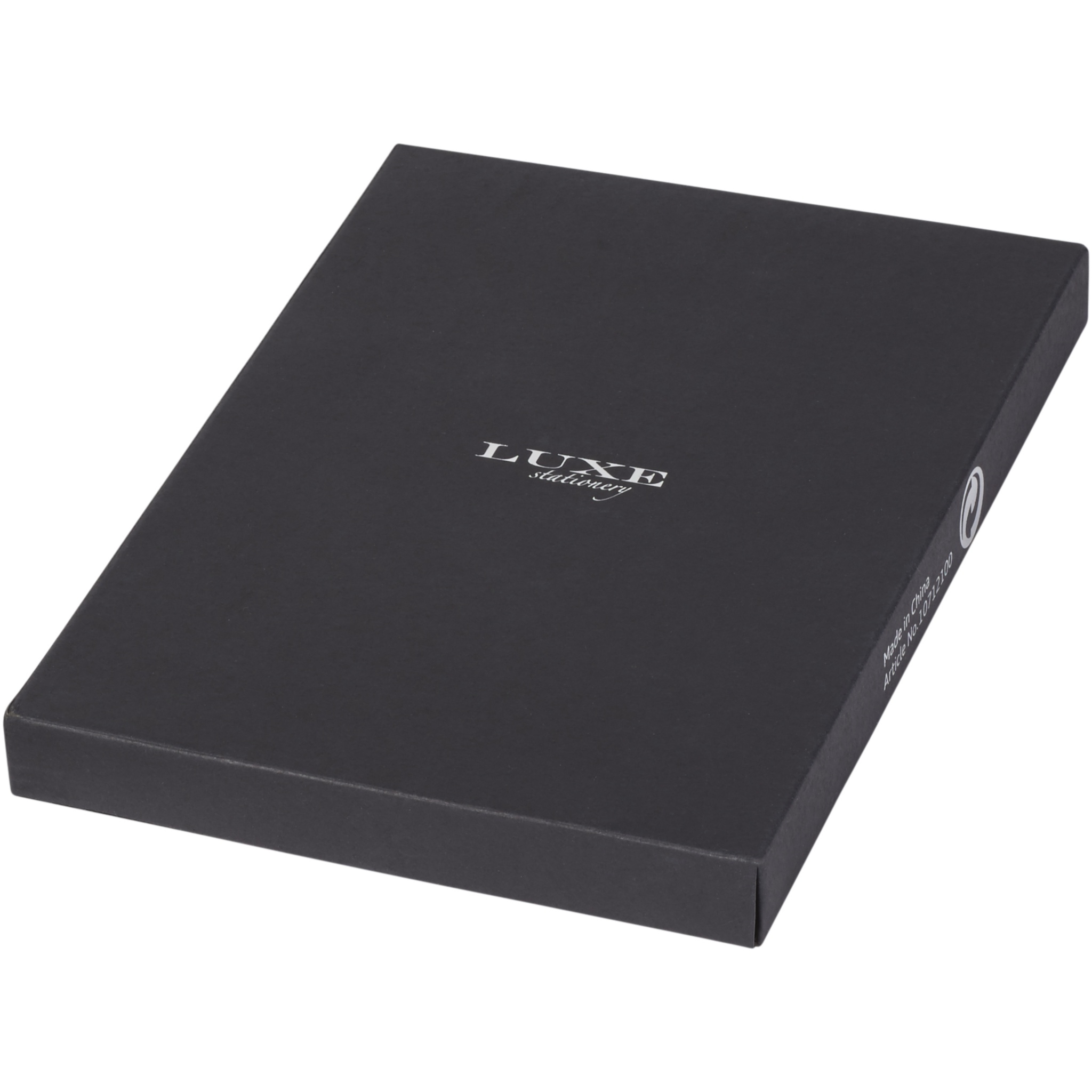 Bound anteckningsbok A5. Exklusivt designad anteckningsbok (A5-storlek) med 80gsm, 80 ark gräddfärgat papper med invändig ryggficka och pennögla. Förpackade i en "LUXE" presentförpackning. Läderimitation.