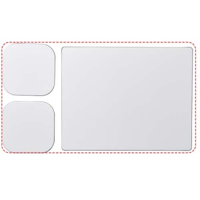 Brite-Mat® Set 3 med musmatta och underlägg. Set med Brite-Mat-musmatta och matchande underlägg. Setet består av en rektangulär musmatta (0,3 x 19 x 24 cm) och två kvadratiska underlägg (0,3 x 9,5 x 9,5 cm). Återvunnen plast, glanspapper och svart plastgranulat.