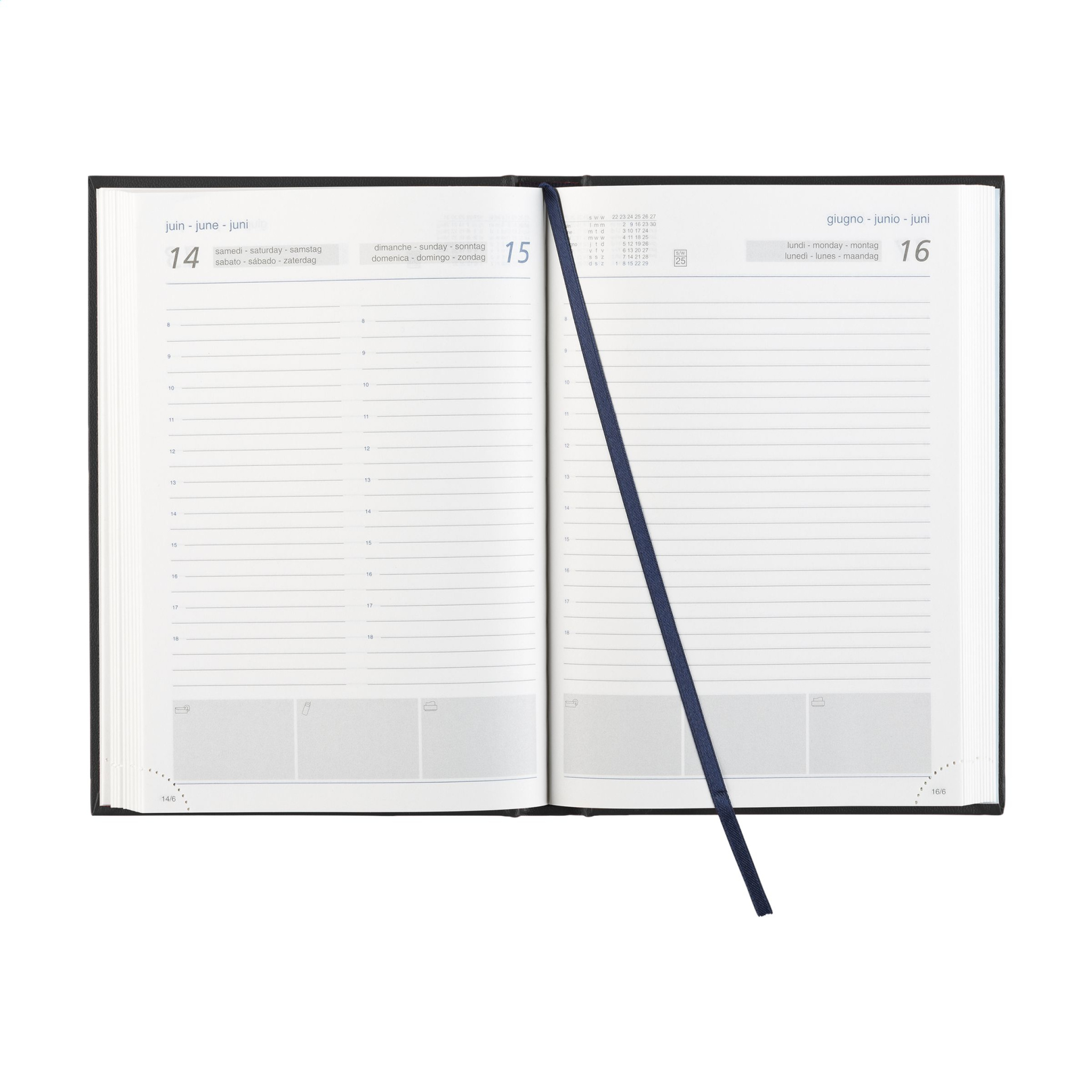 Kontorsdagbok på sex språk: EN, NL, F, D, I och ES. Med hållbart vadderat Balacron-omslag och årtalet dekorativt präglat på framsidan, 70 g vitt, FSC Mix-certifierat papper, tryckt i 2 färger, trådbundet, med avrivna daterade hörn, en dag per sida (lördag och söndag tillsammans), år planerare innevarande år och 2 kvartal nästa år, notera utrymme för varje dag, ytterligare sidor med användbar information. Nära A5 storlek.