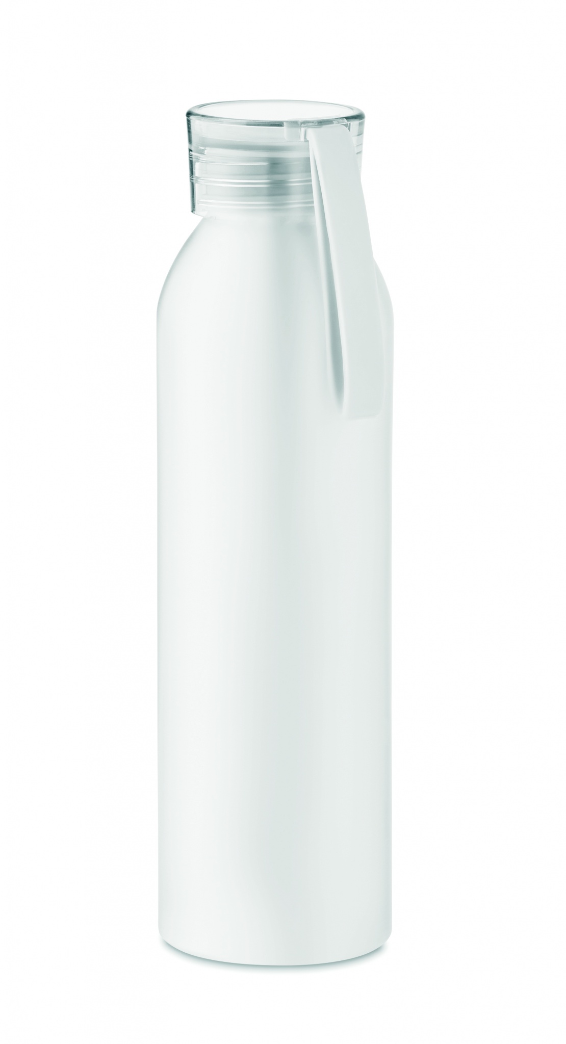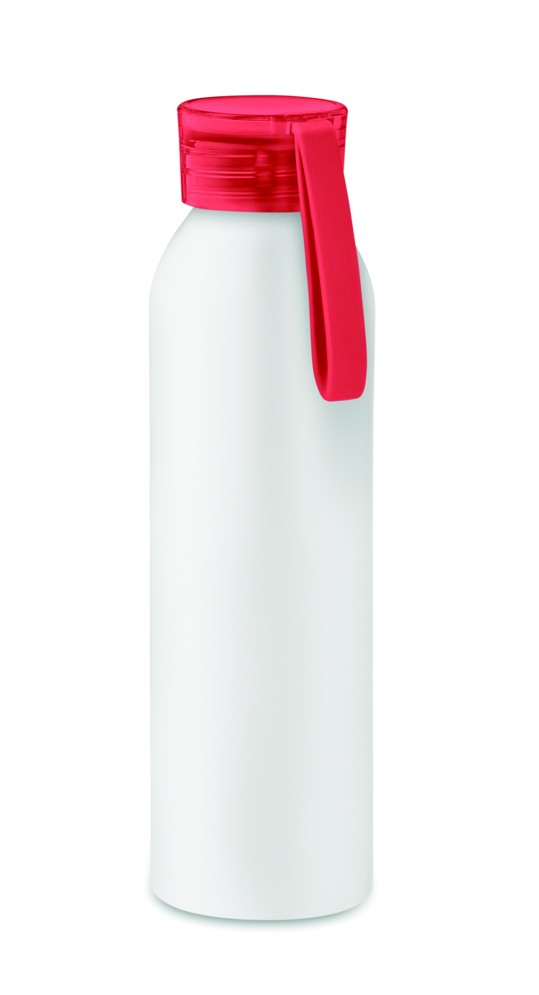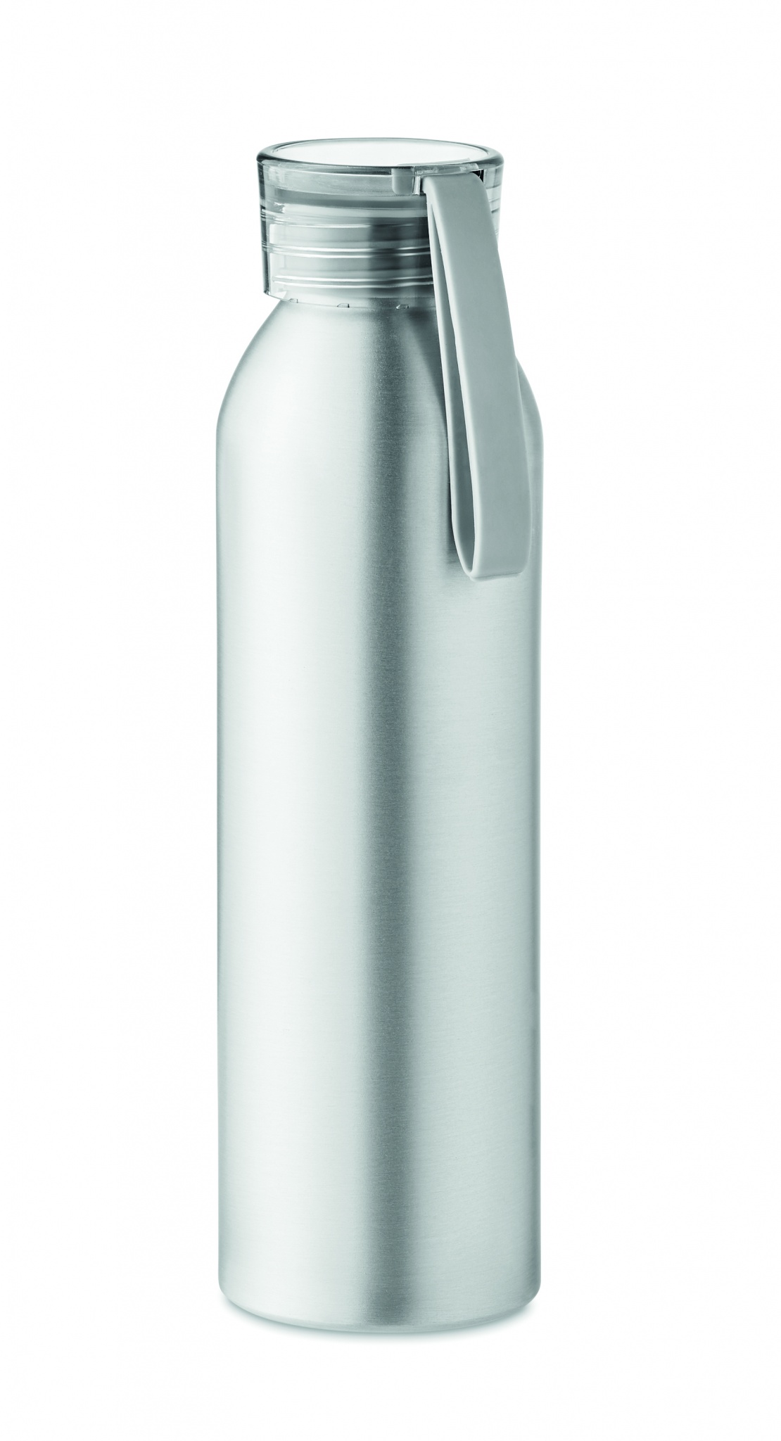 Flaska i återvunnen aluminium med PS-locket och silikonhängare. Kapacitet: 600 ml. En enkel och lätt flaska för vardagen och utmärkt för att öka din varumärkesexponering. Det är viktigt att hålla vätskebalansen under dagen, så fyll den här flaskan med vatten och ha den med dig. Läcker inte. Tål ej diskmaskin.
