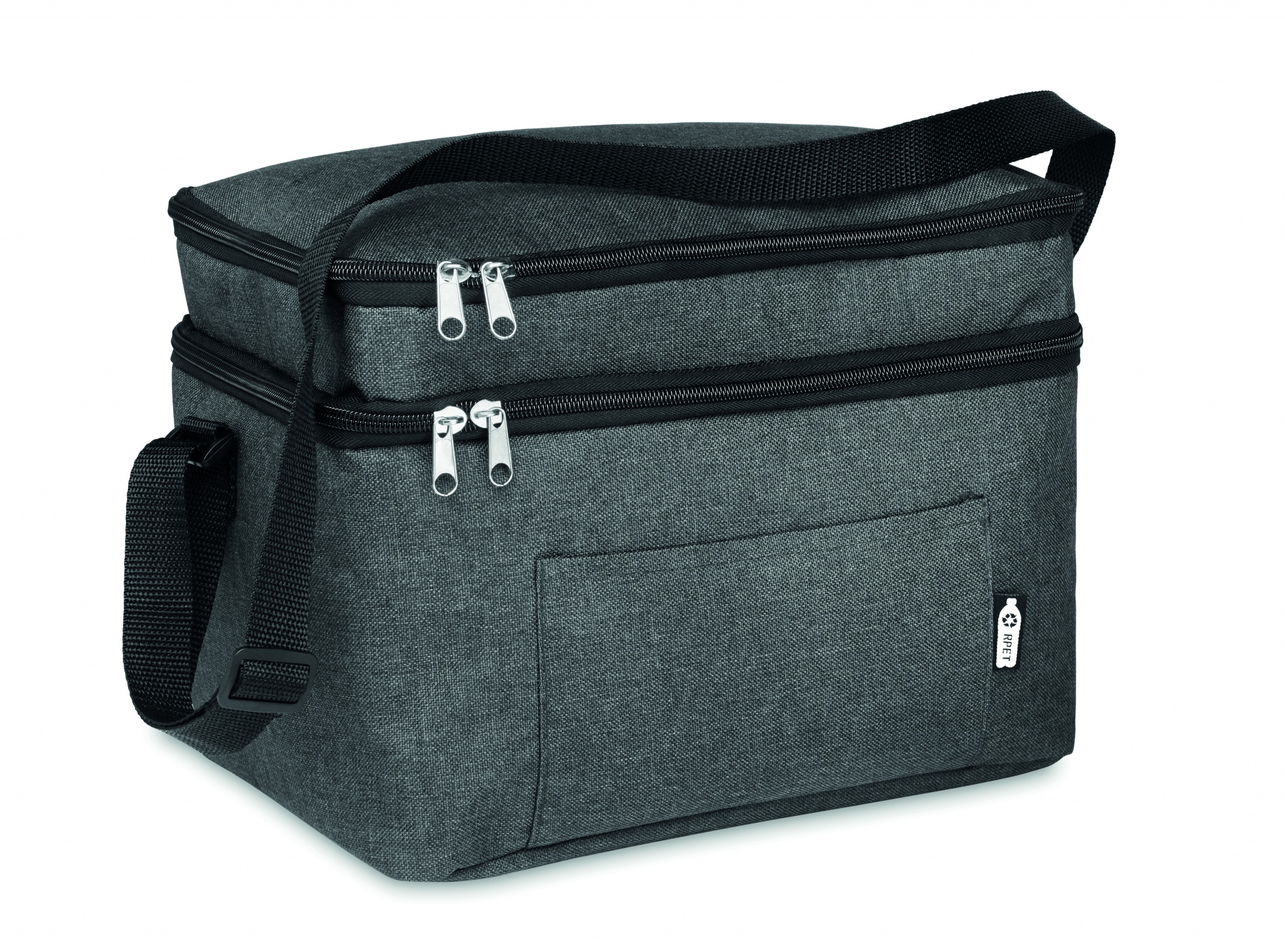 2-färgad kylväska i 600D RPET och PEVA fodrad. 2 fack, en frontficka och justerbar axelband.