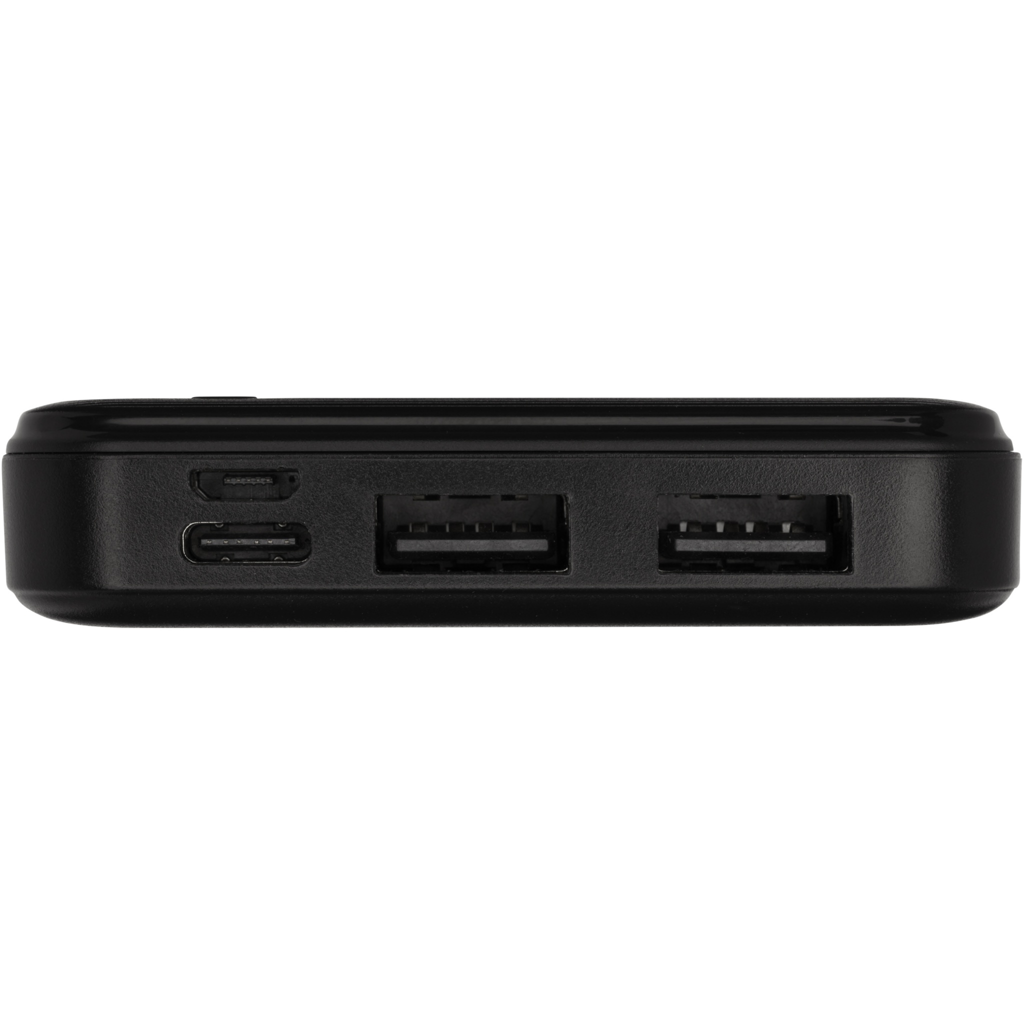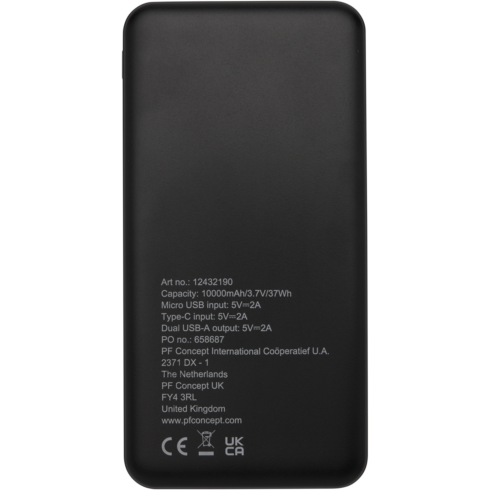 Powerbank tillverkad av återvunnen ABS-plast. Powerbanken innehåller ett litiumpolymerbatteri på 10 000 mAh med lång livslängd för snabb laddning. Strömindikatorerna visar återstående energinivå så att du alltid vet när du måste ladda den. Type-C-ingång 5 V/2 A, mikro-USB-ingång 5 V/2 A, dubbel USB-A-utgång 5 V/2 A, total effekt 10 W. Levereras med en 30 cm TPE 2 A USB-A till Type-C-laddningssladd, en bruksanvisning och en presentförpackning i kraftpapper.