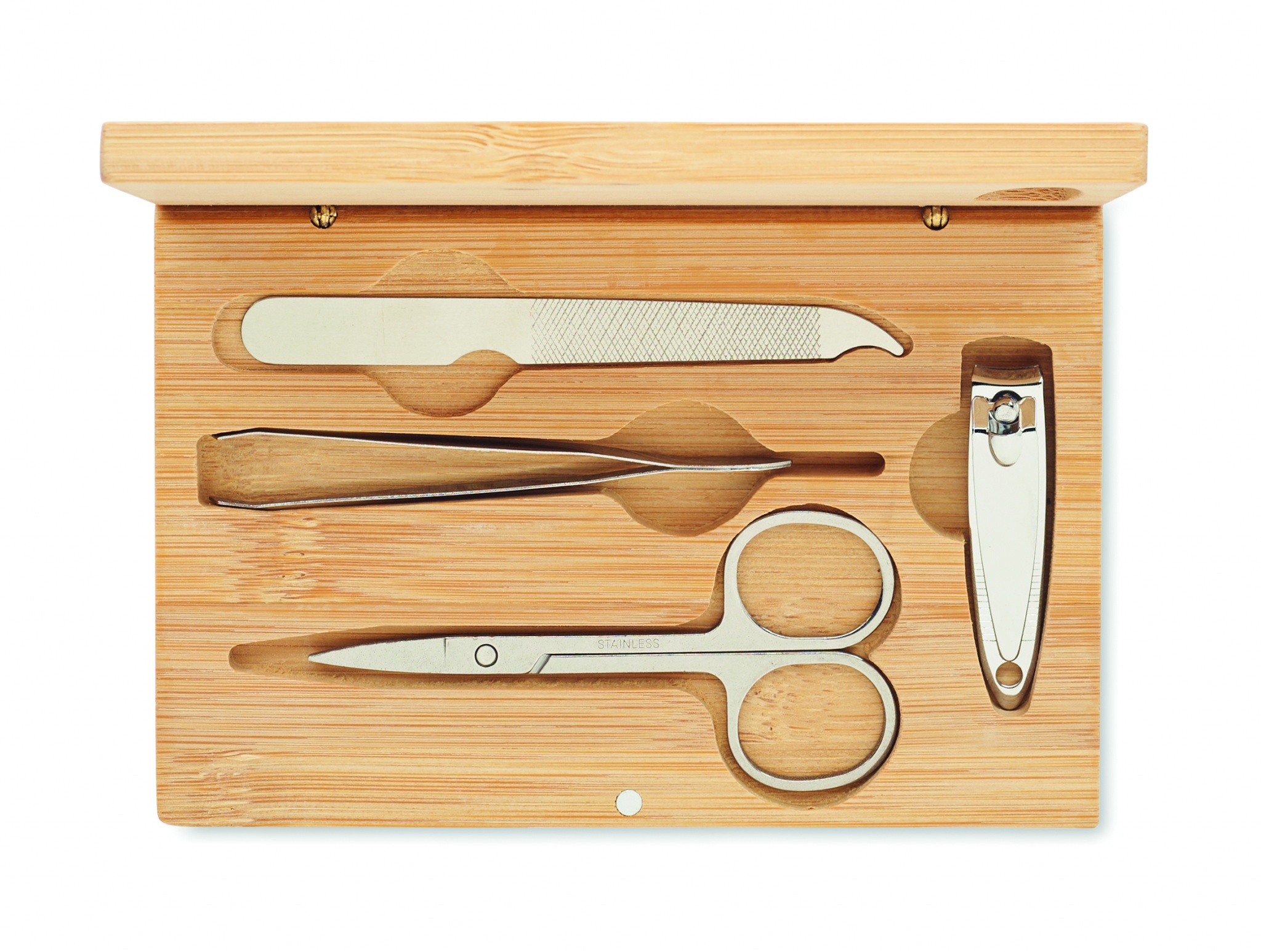 4-delat manikyrset i rostfritt stål i ett bambufodral med magnetisk stängning. Innehåller: böjd nagelsax, nagelklippare, nagelfil och pincett.