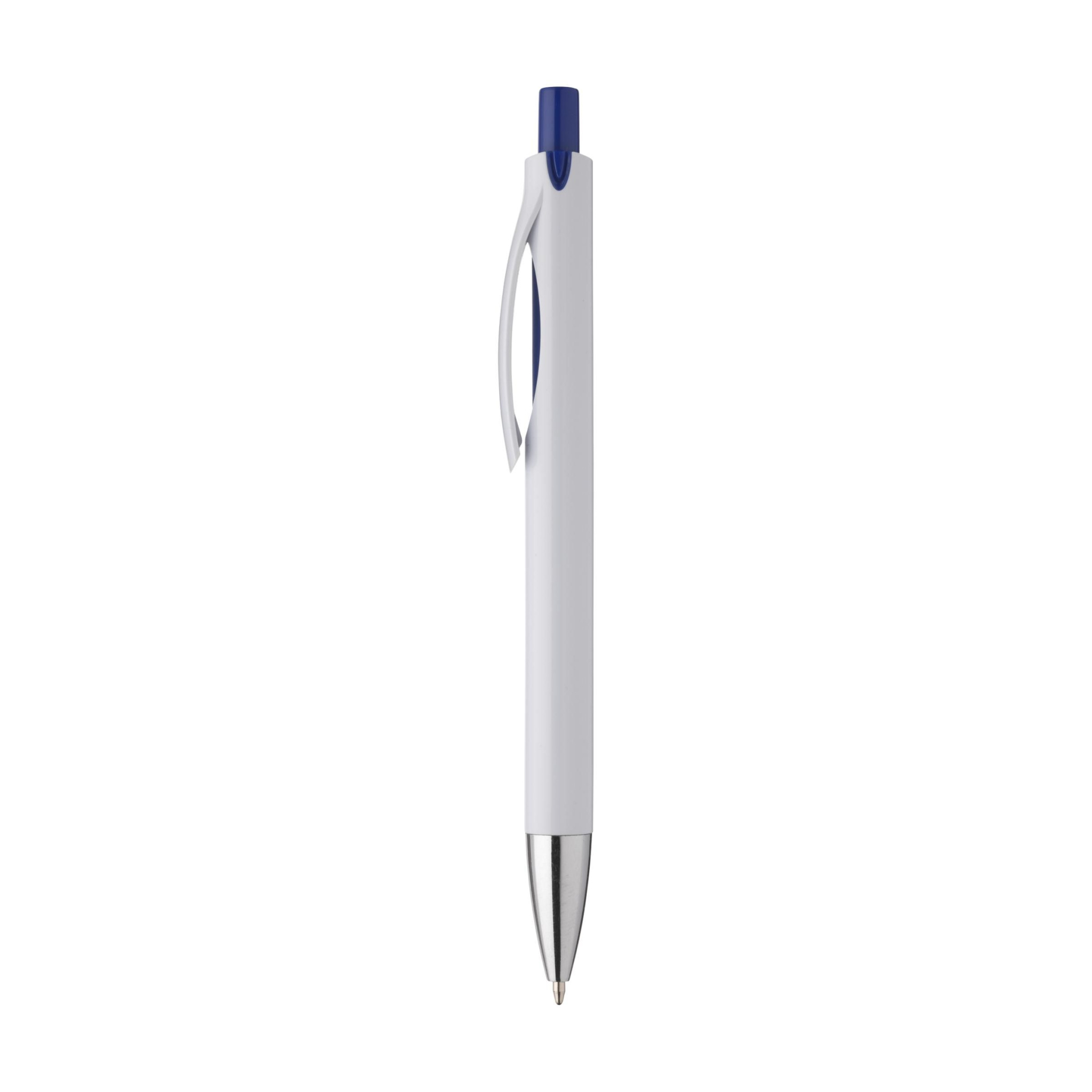 Kulspetspenna med blått bläck med snygg design: kroppen och klämman på denna penna är integrerade. Slående färgaccent under klippet. Denna accentfärg matchar tryckknappens färg.