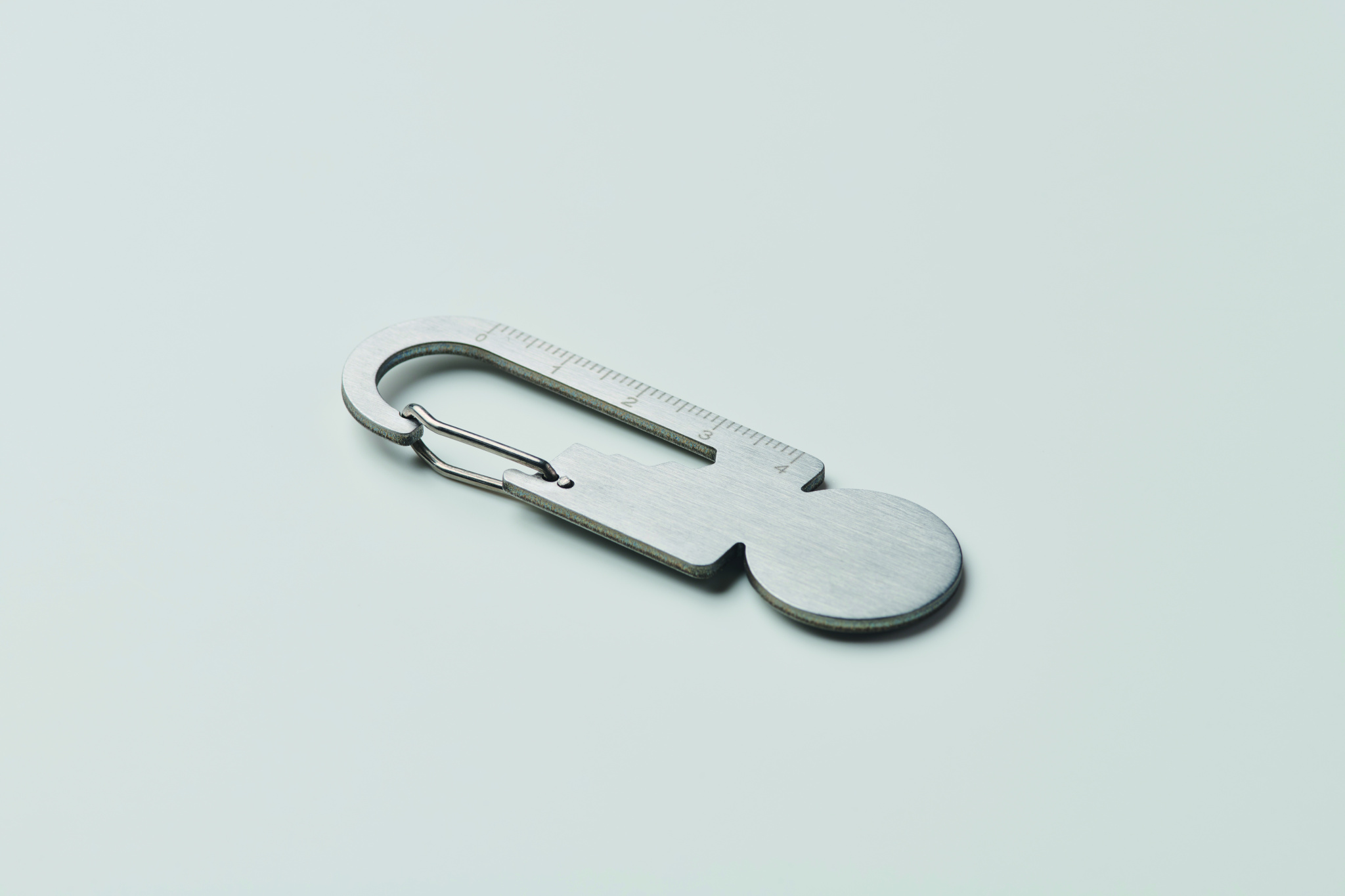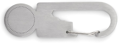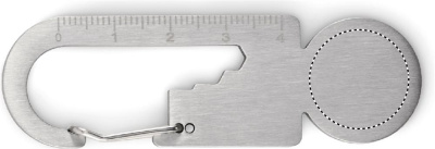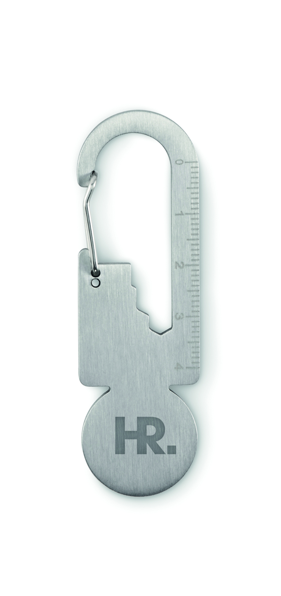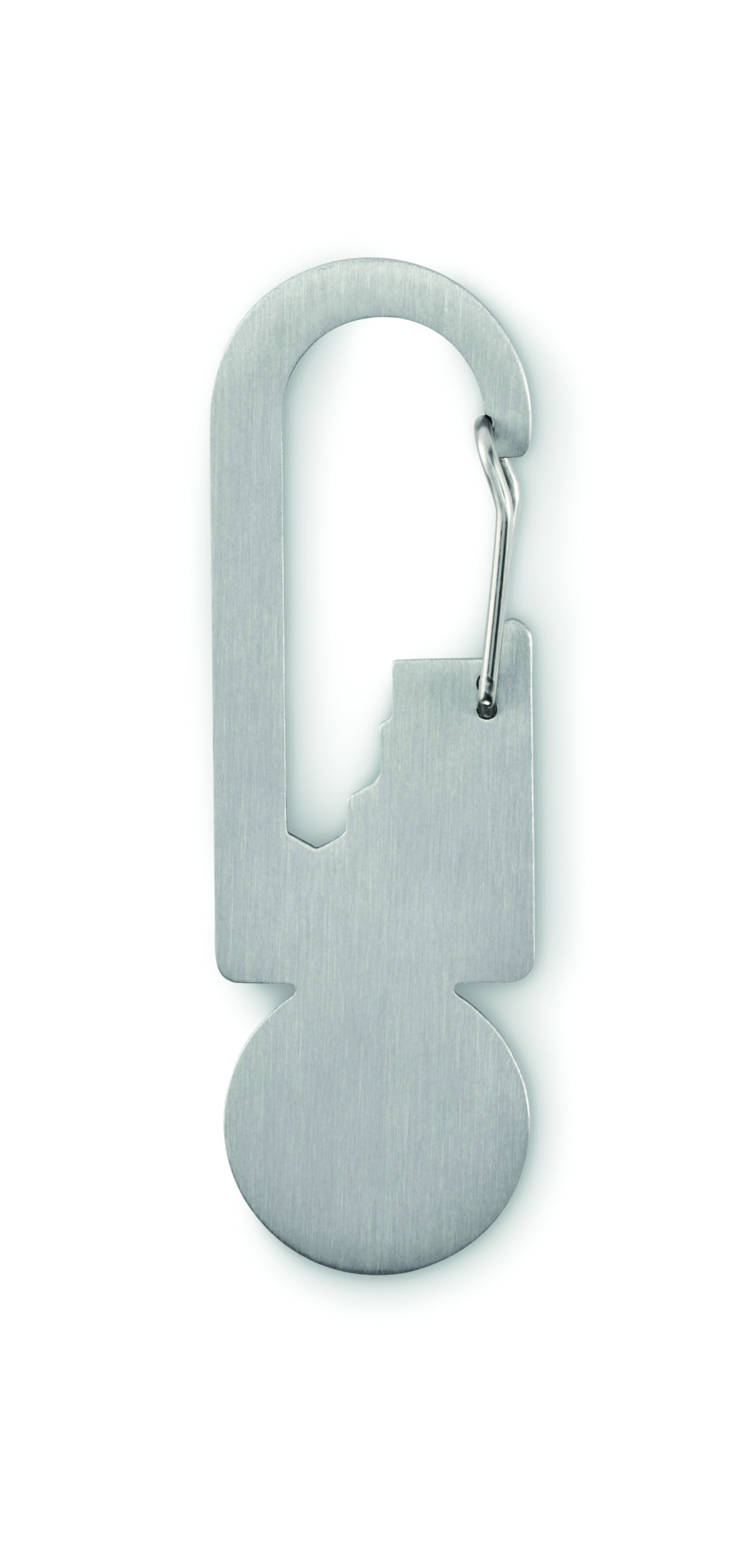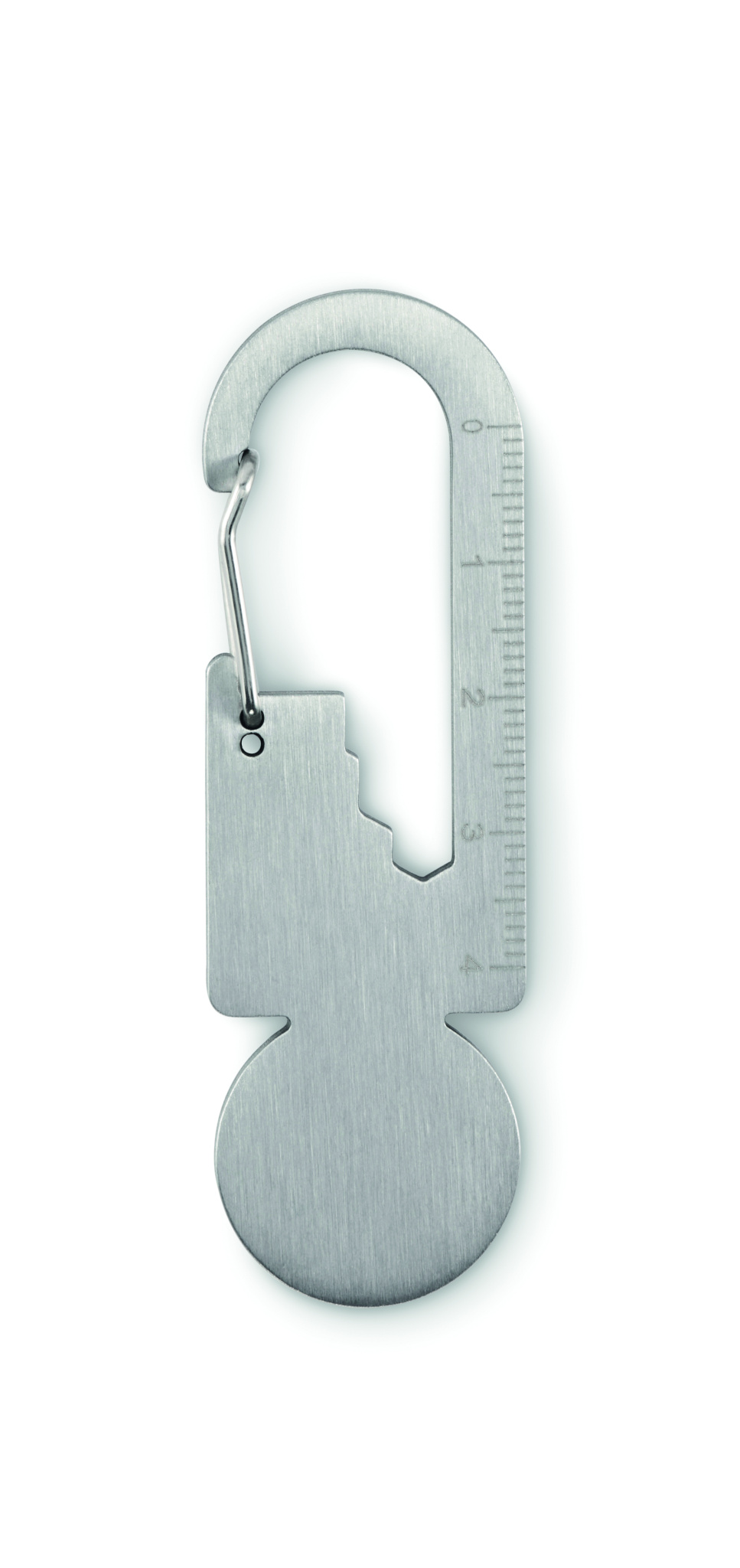 Nyckelring med 1€ kundvagnsmynt i återvunnet rostfritt stål (90% återvunnet och 10% rostfritt stål) med ett multifunktionsverktyg som inkluderar flasköppnare, linjal och sexkantsnyckel 5,5 mm, 7 mm och 8 mm.