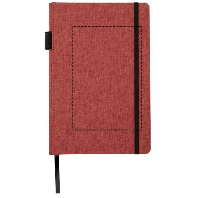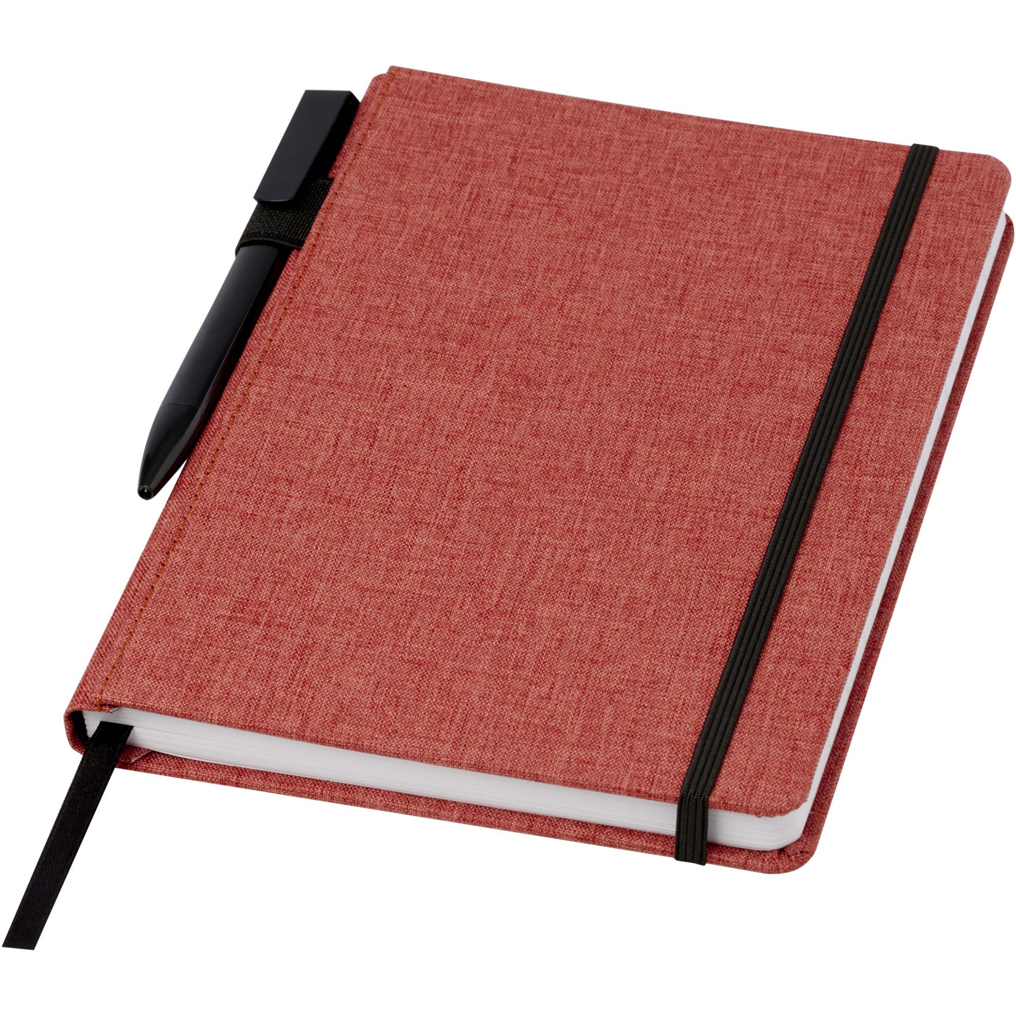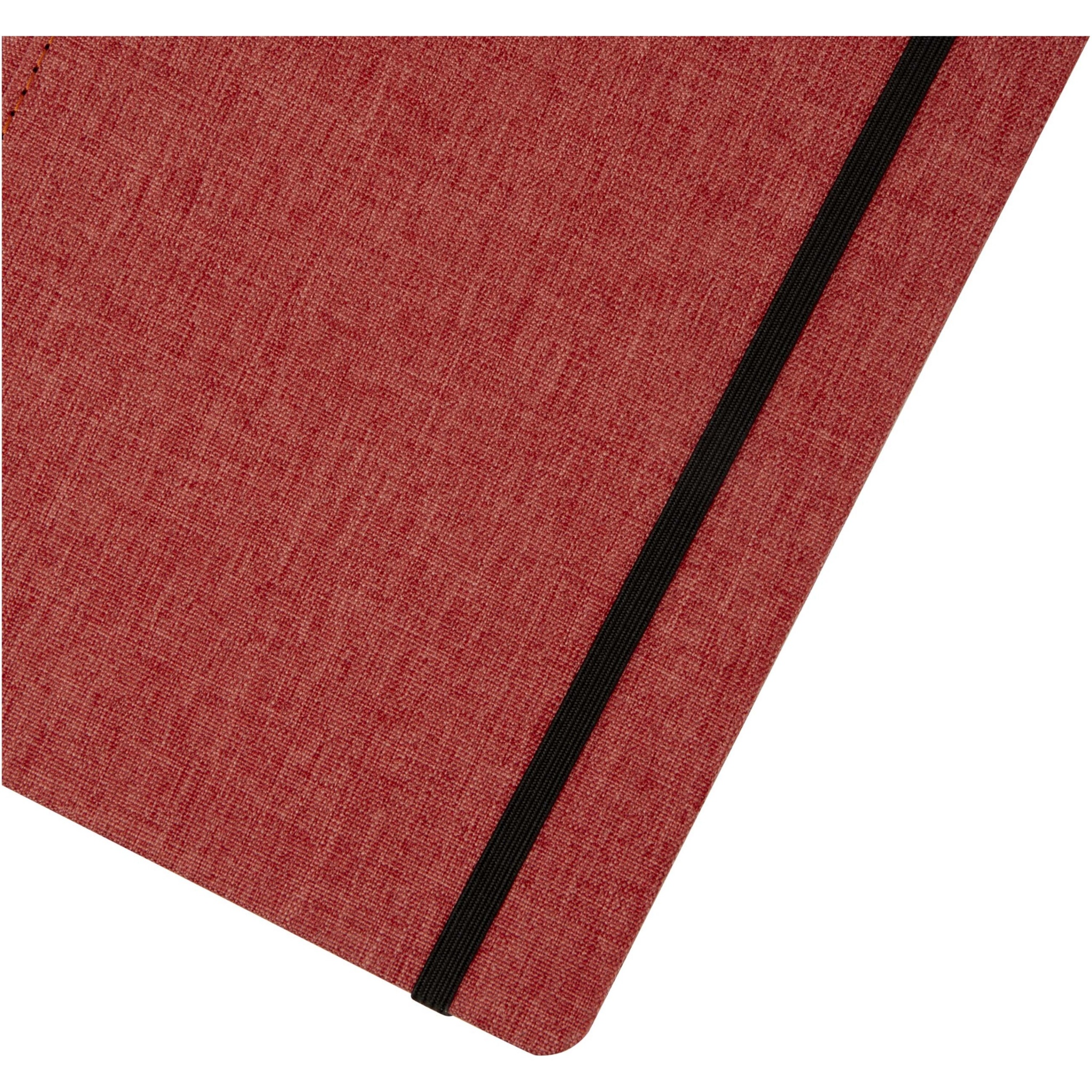 A5 storlek anteckningsbok med fodral av RPET tyg. Har 96 ark 70 g/m² återvunnet papper med fodrad layout, en pennslinga och bandmarkör. Inpackad i ett kartonghölje.