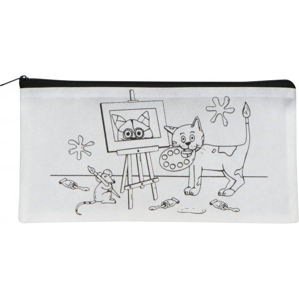 Non-woven pennfodral med fem kritor (gul, svart, blå, röd och grön), tryckt med en glad design för färgläggning. Perfekt för att underhålla barn och främja deras fantasi.