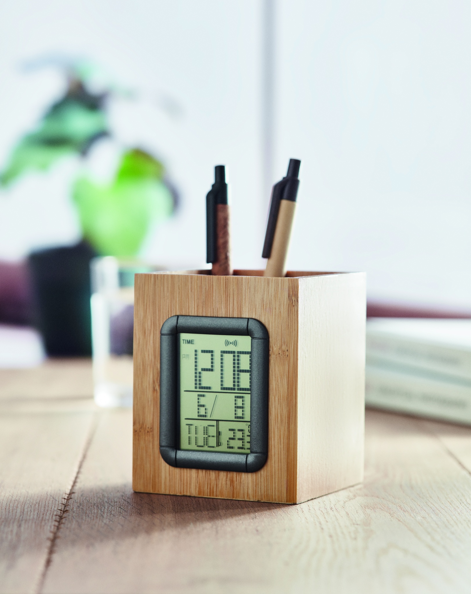 Logotrade reklamprodukter bild: Pennhållare bambu LCD klocka