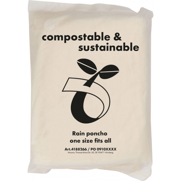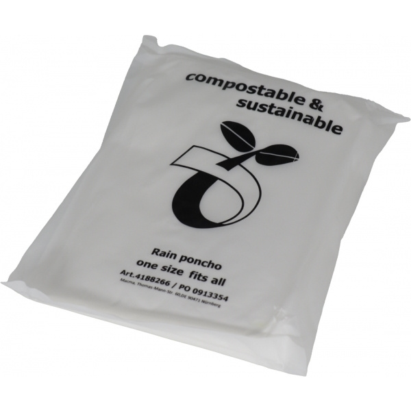 Ftalatfri komposterbar regnponcho av PLA med bärväska. Denna poncho är ett hållbart alternativ. Din logotyp kommer att tryckas på väskan.