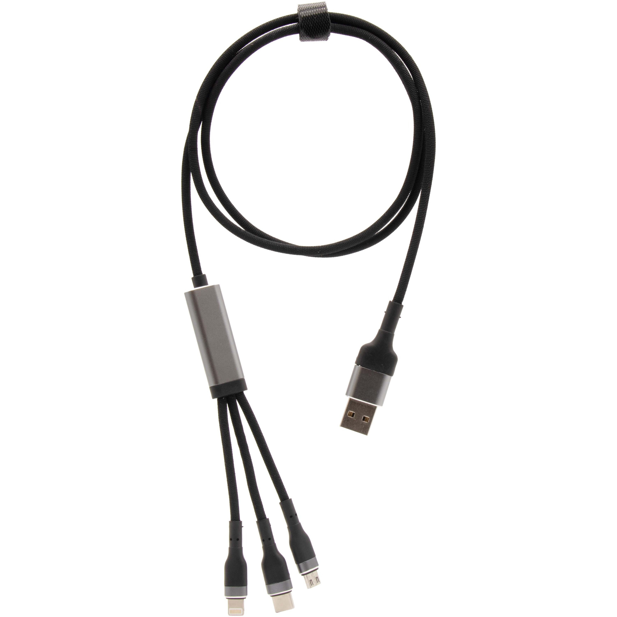 5-i-1 ultrasnabb rPET 100 W ultrasnabb laddningskabel som kan ladda smartphones, surfplattor och bärbara datorer. Den dubbla USB-A + USB-C-ingången gör kabeln 100 % kompatibel med de senaste datormodellerna. Utgång Typ-C, Micro USB och lightning. Levereras med återvinningsbar TPU-påse och en inlaga av återvunnet papper. Kabellängd: 1 meter.