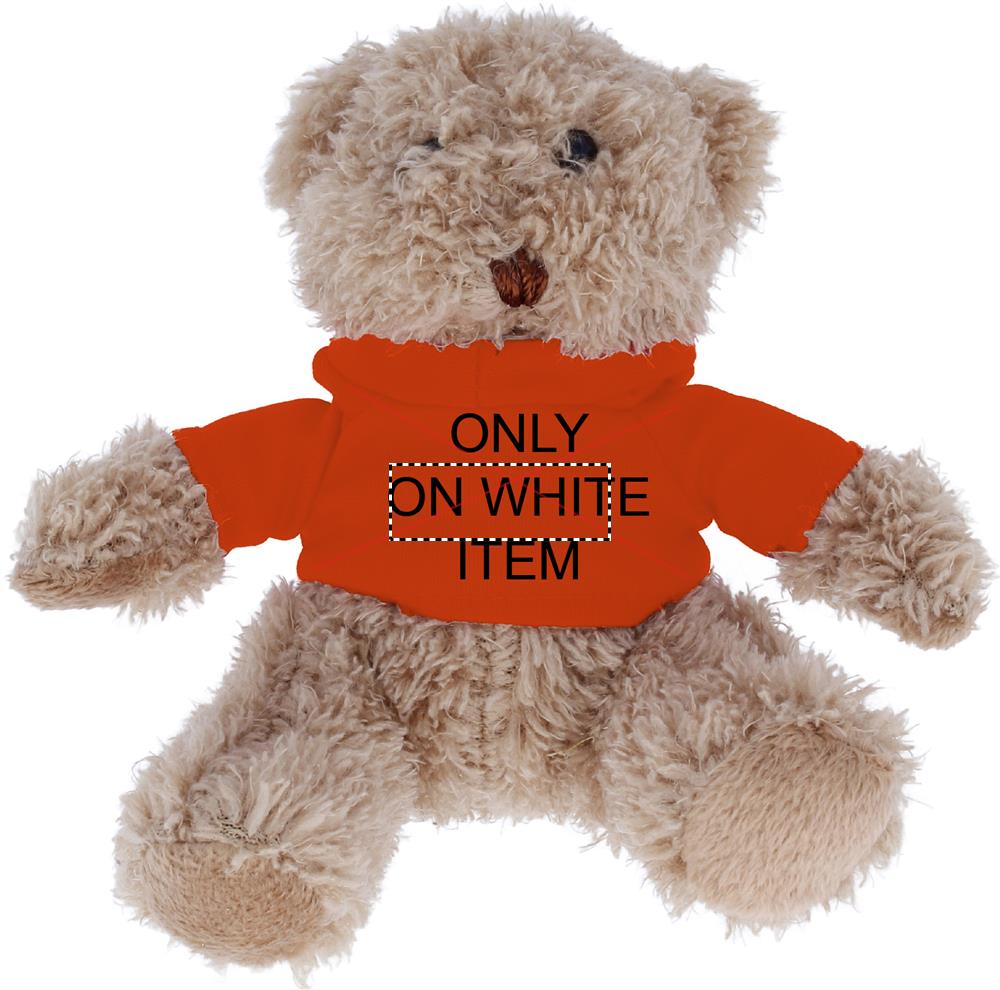 Teddybjörn i plysch. Klädd i en tryckbar huvtröja. Sublimeringstryck endast på vit produkt.