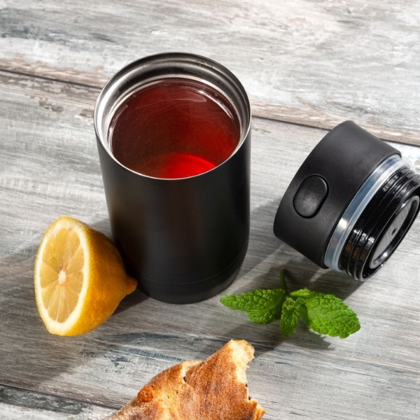Dubbelväggig termomugg i svart färg med en volym på 240 ml, som är tillverkad i rostfritt stål. Muggen håller temperaturen på din dryck ca. 5 timmar (mätt vid rumstemperatur), vilket gör den perfekt för ditt te eller kaffe. Förpackad i presentförpackning.