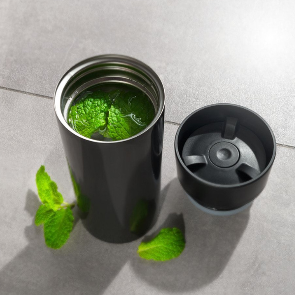 Dubbelväggig termomugg i antracitfärg med en volym på 300 ml. Den är gjord av rostfritt stål. Muggen håller temperaturen på din dryck ca. 6 timmar (mätt vid rumstemperatur), vilket gör den perfekt för ditt te eller kaffe. Tack vare 360°-öppningen tillåter den att dricka runt om. Förpackad i presentförpackning.