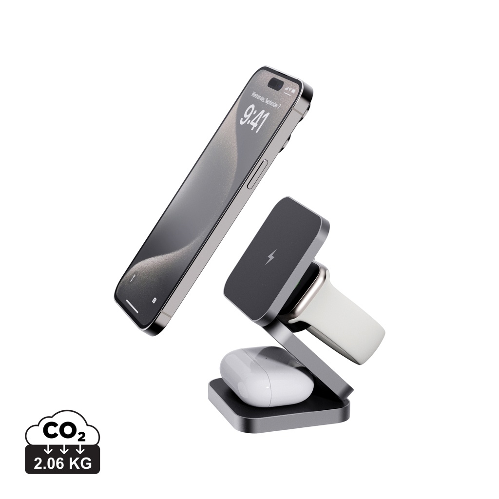 Lyxig och hopfällbar trådlös 3-i-1-laddare tillverkad av RCS-återvunnen ABS och RCS-återvunnen aluminium. Totalt återvunnet innehåll: 46% baserat på total produktvikt. RCS-certifieringen säkerställer en helt certifierad leveranskedja för de återvunna materialen. Den trådlösa laddaren är utrustad med en magnetisk 15W trådlös laddare och en extra 5W trådlös laddare som passar för öronsnäckor eller andra små trådlösa laddningsbara enheter och en 2,5W trådlös laddare för smartwatches (endast Apple-klockor). 120cm laddningskabel i RCS-certifierad återvunnen TPE medföljer. Levereras i FSC®-mixad kraftförpackning. Produkt och tillbehör 100% PVC-fria. Input: 9V/3A för optimal användning. Output: Telefon: 9V/1,1A; 9V/1,67 A/(15W), Hörlurar: 5V/1A (5W), klocka: 5V/0,5A. PVC-fri.