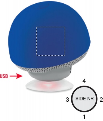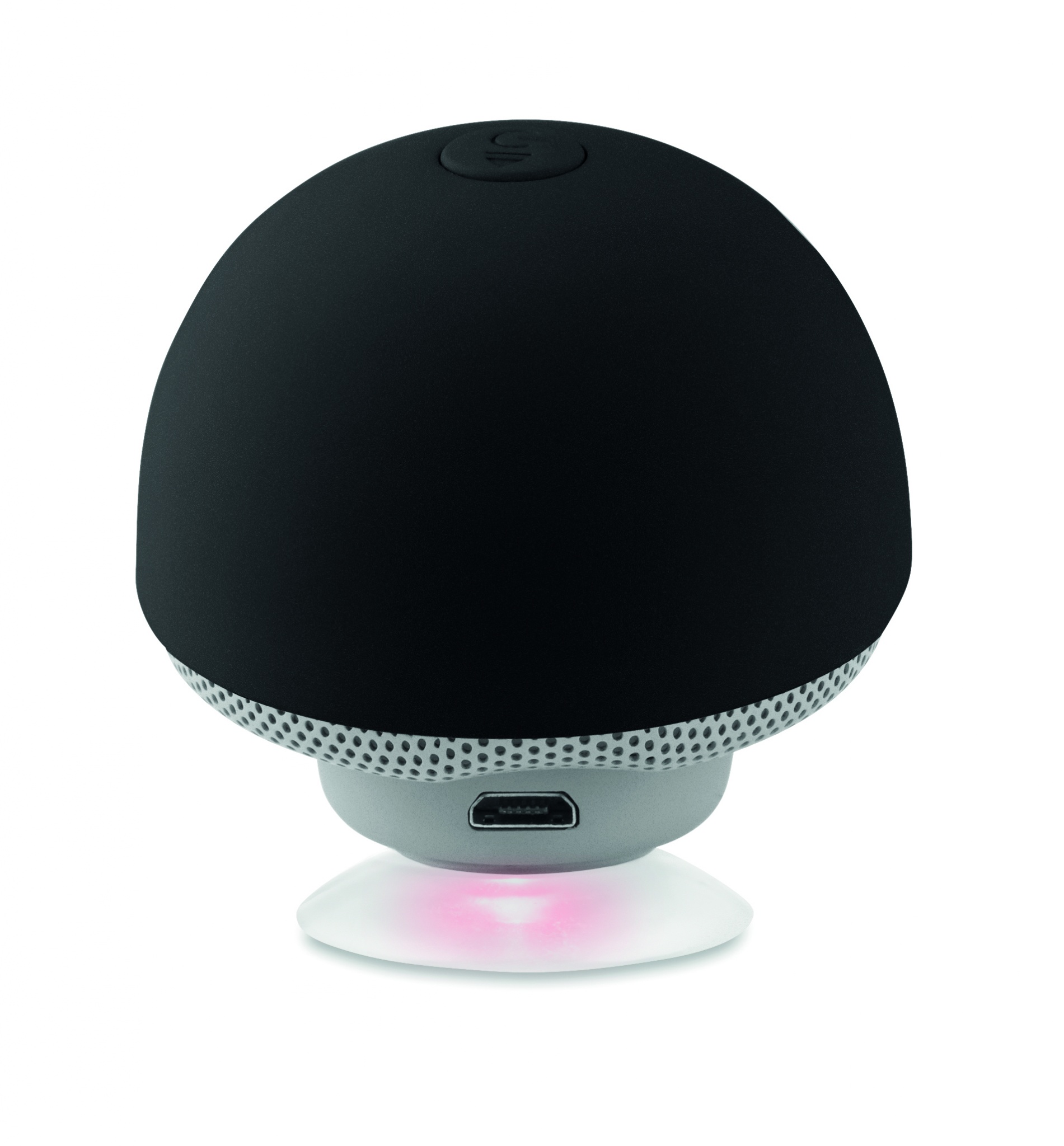 Trådlös högtalare i svampform. Högtalaren kan fästas på en slät yta eller användas som telefonställ. Materialet är ABS med sugpropp i gummi. Innehåller ett laddningsbart 180 mAh Li-ion batteri. USB-laddningskabel ingår. 3 ,5 mm hörlurskontakt. Output: 4 Ohm, 5V och 3W. Speltid ca 2 timmar.
